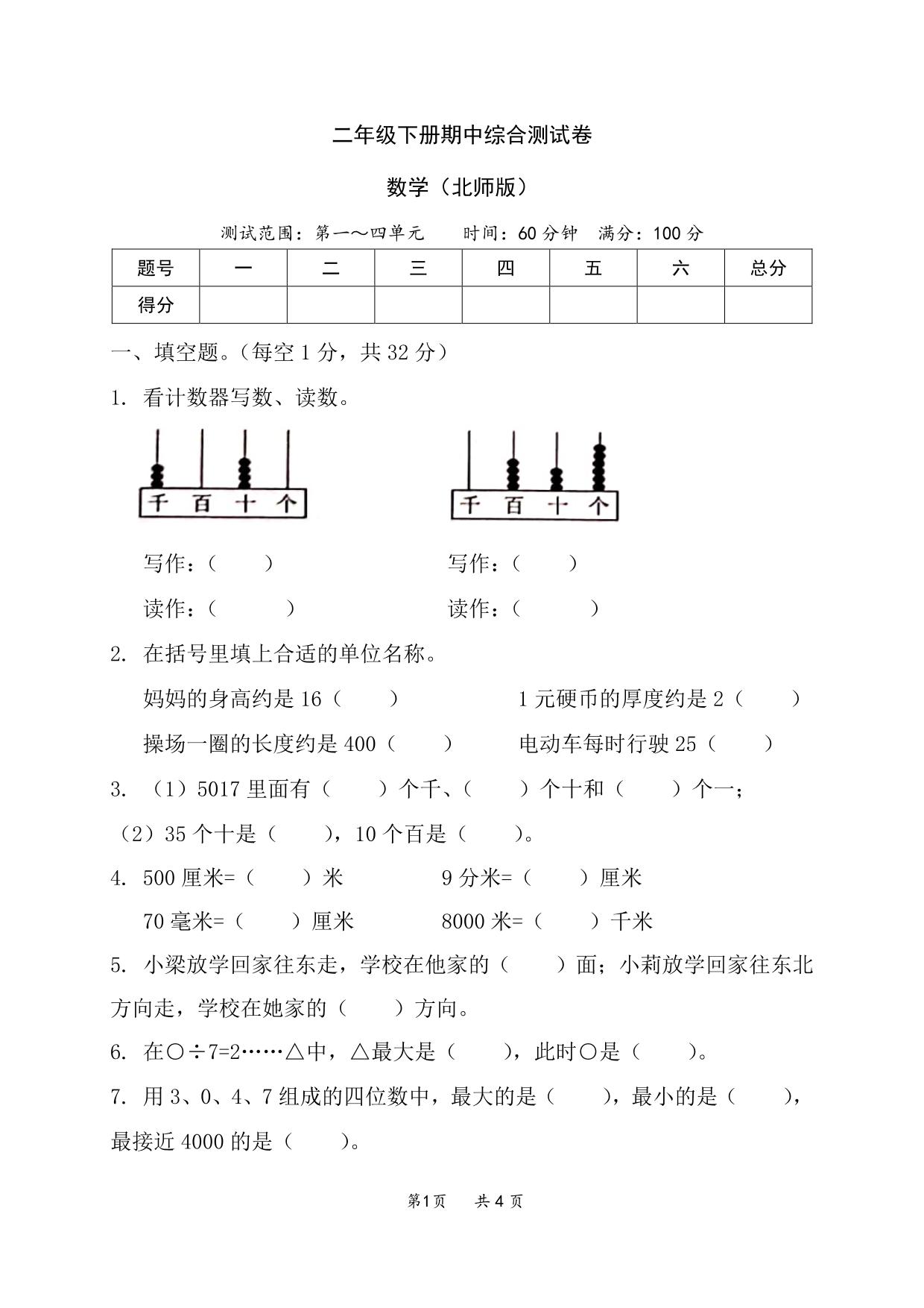 2022年二年级下册期中综合测试卷(北师版)