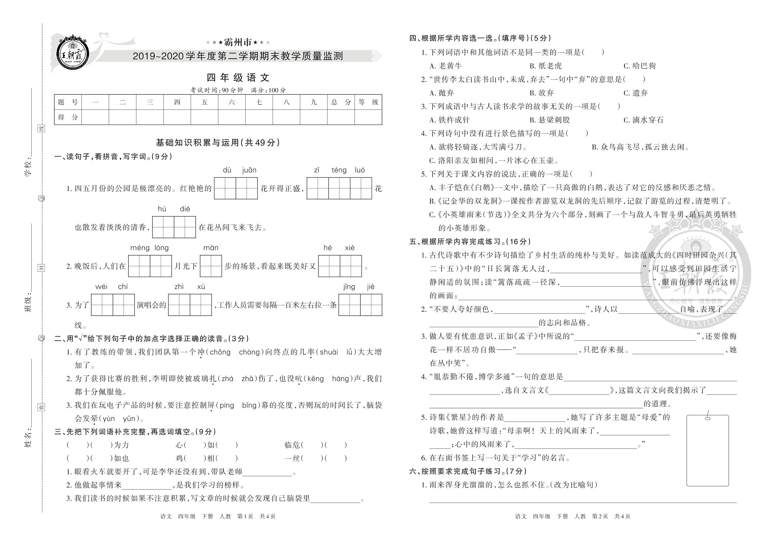霸州市2019~2020学年度第二学期期末教学质量监测四年级语文(人教版)