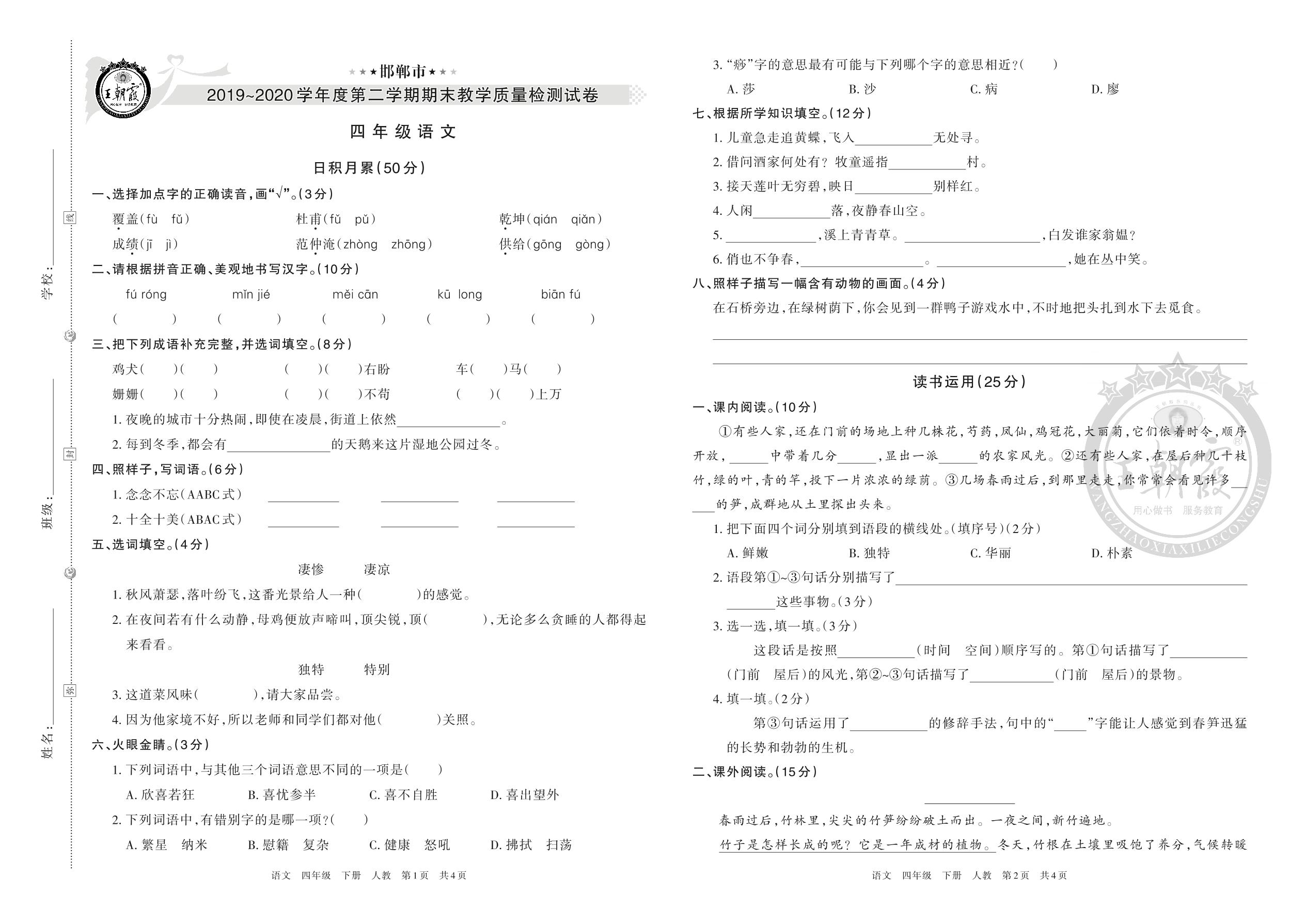 邯郸市邯山区2019~2020学年度第二学期期末教学质量检测试卷四年级语文(人教版)