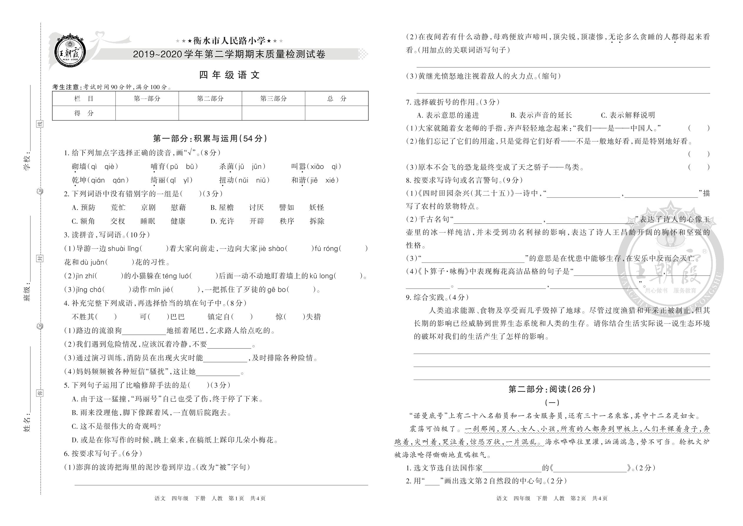 衡水市人民路小学2019~2020学年第二学期期末质量检测试卷四年级语文(人教版)