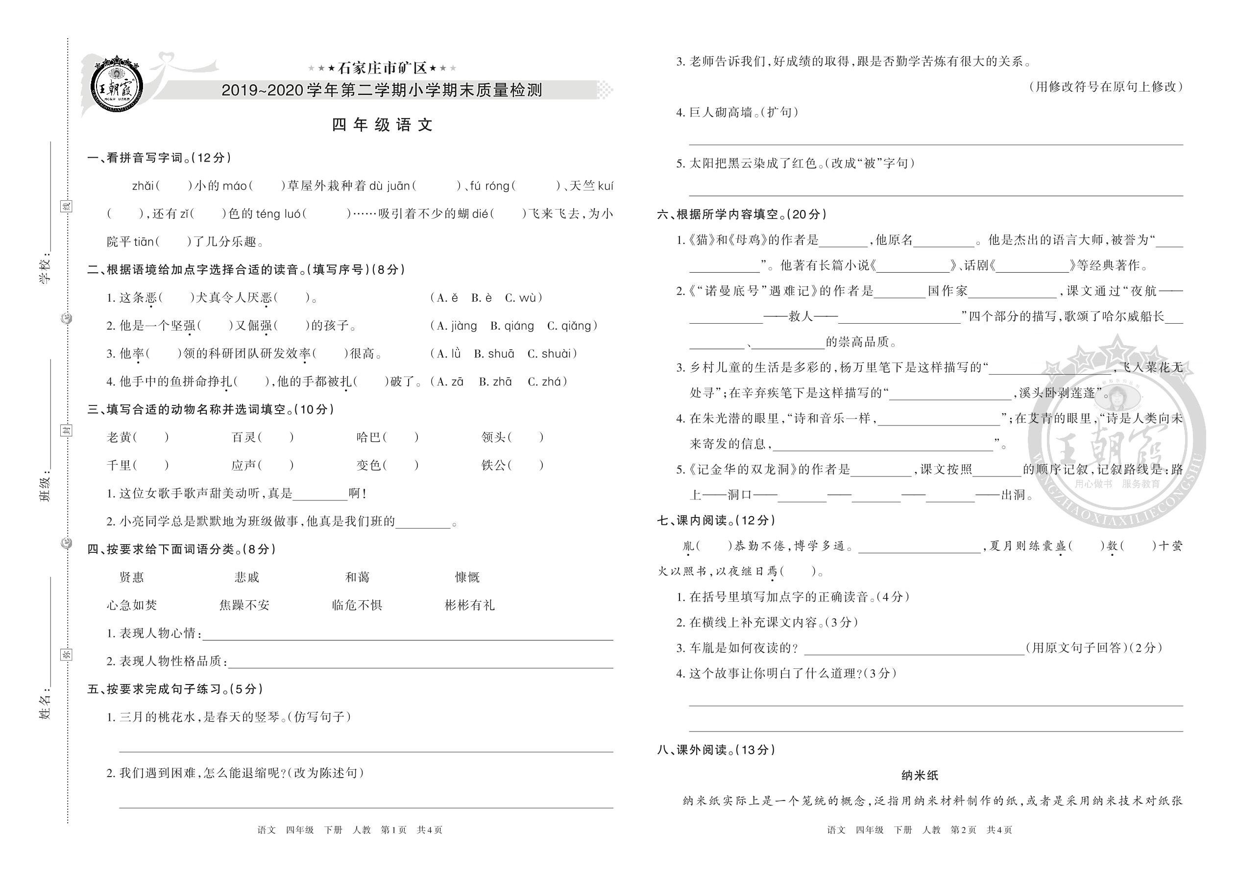 石家庄市矿区2019~2020学年第二学期小学期末质量检测四年级语文(人教版)