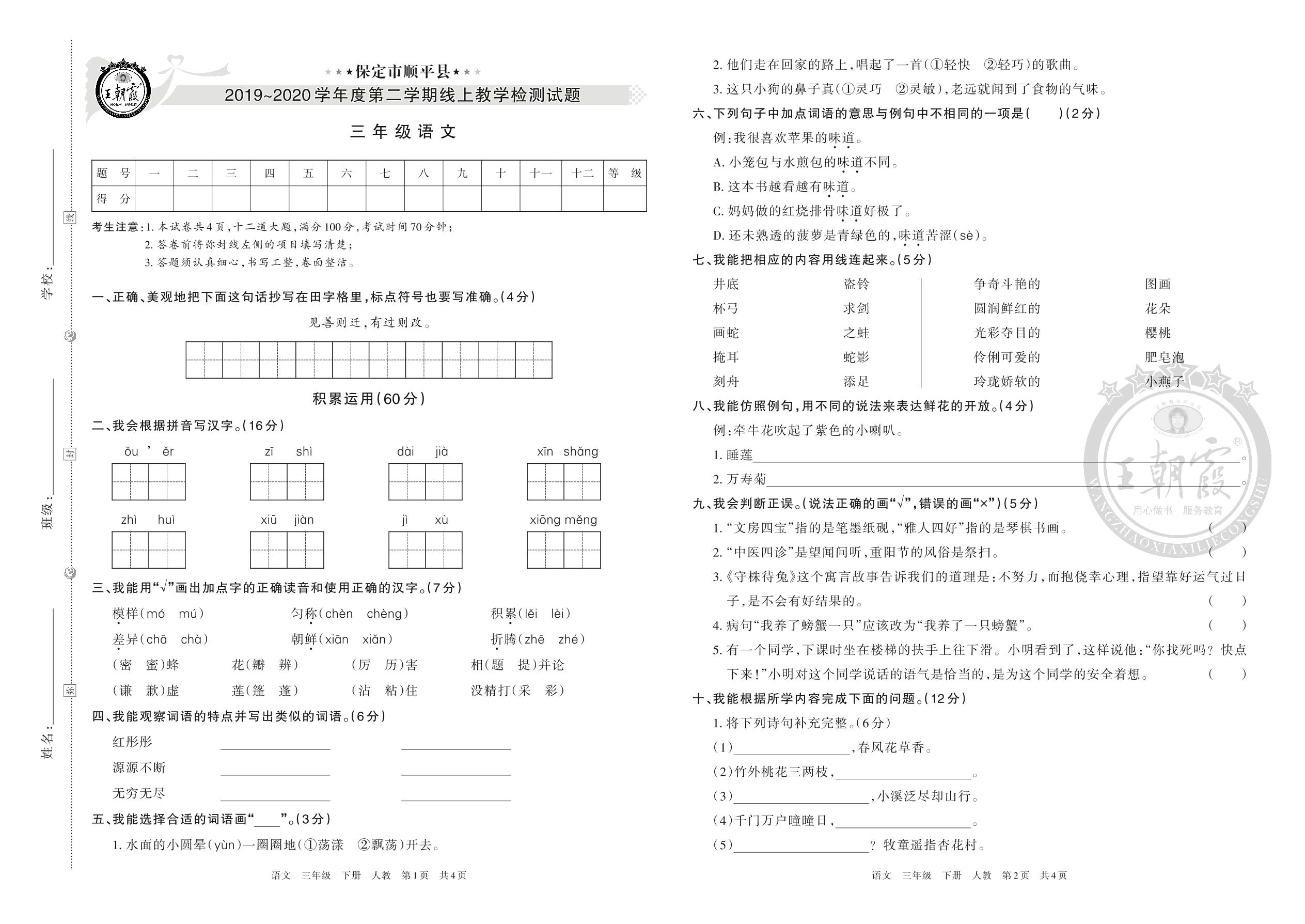 顺平县2019~2020学年度第二学期线上教学检测试题三年级语文(人教版)
