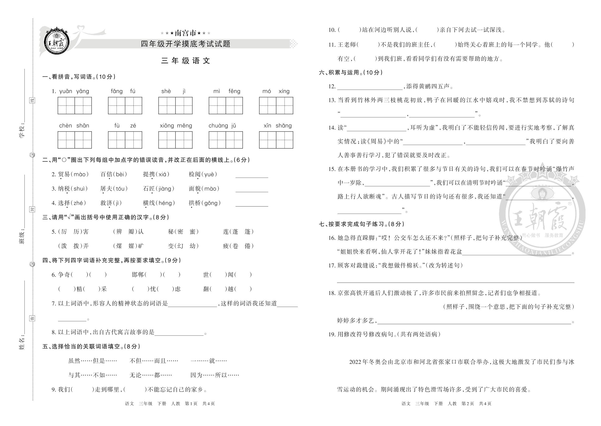 南宫市开学摸底考试语文试题三年级语文(人教版)