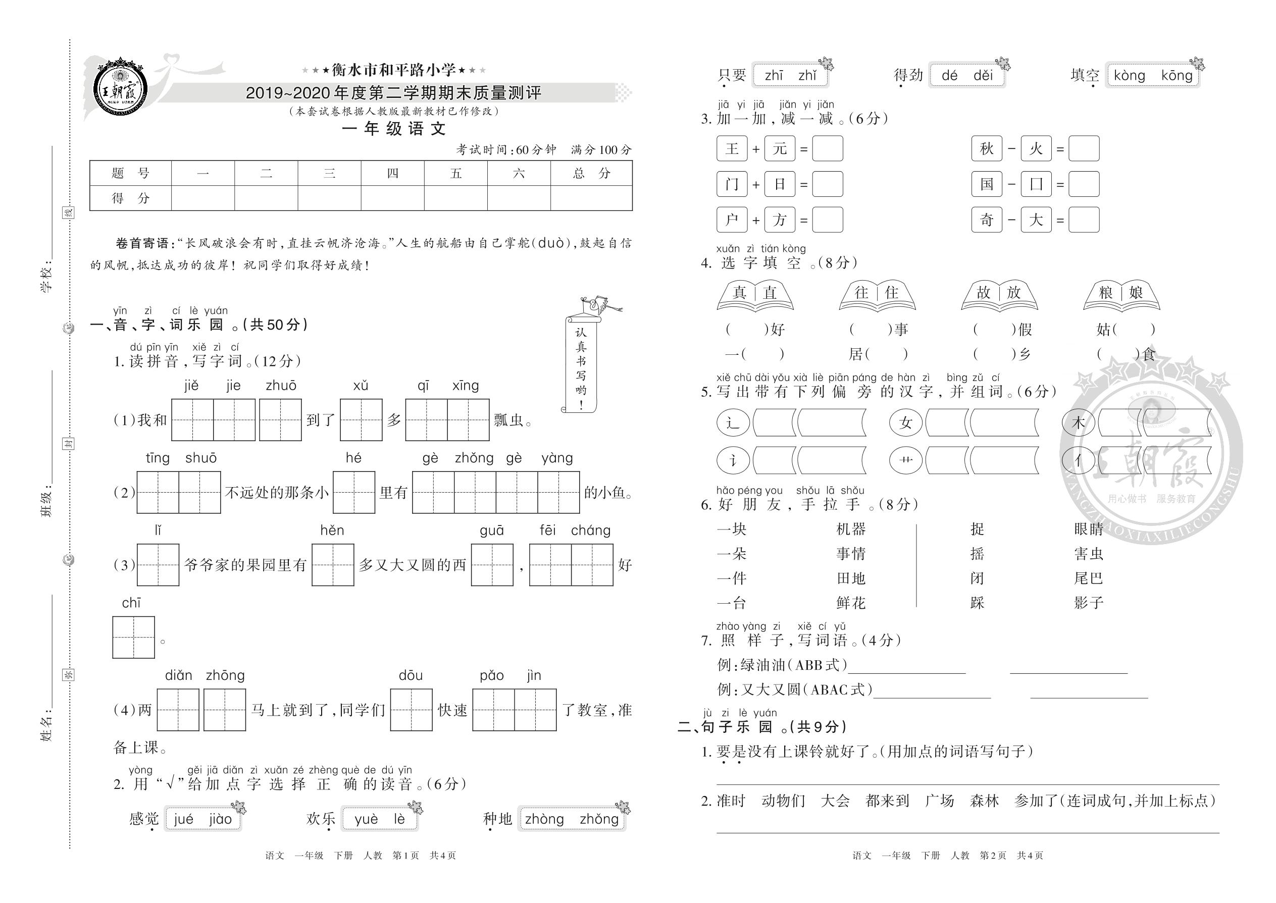 衡水市和平路小学2019~2020学年度第二学期期末质量测评一年级语文(人教版)