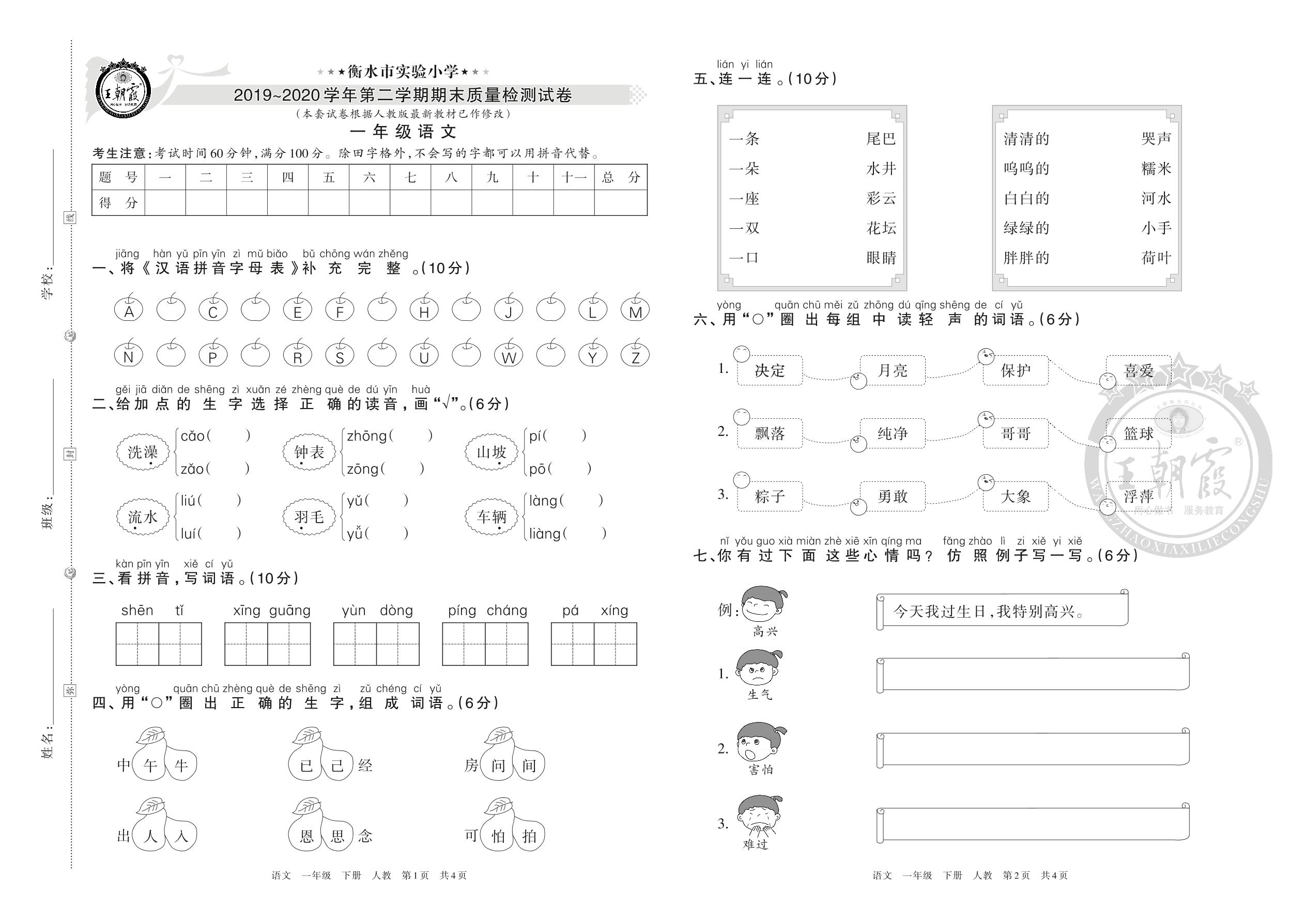 衡水市实验小学2019~2020学年第二学期期末质量检测试卷一年级语文(人教版)
