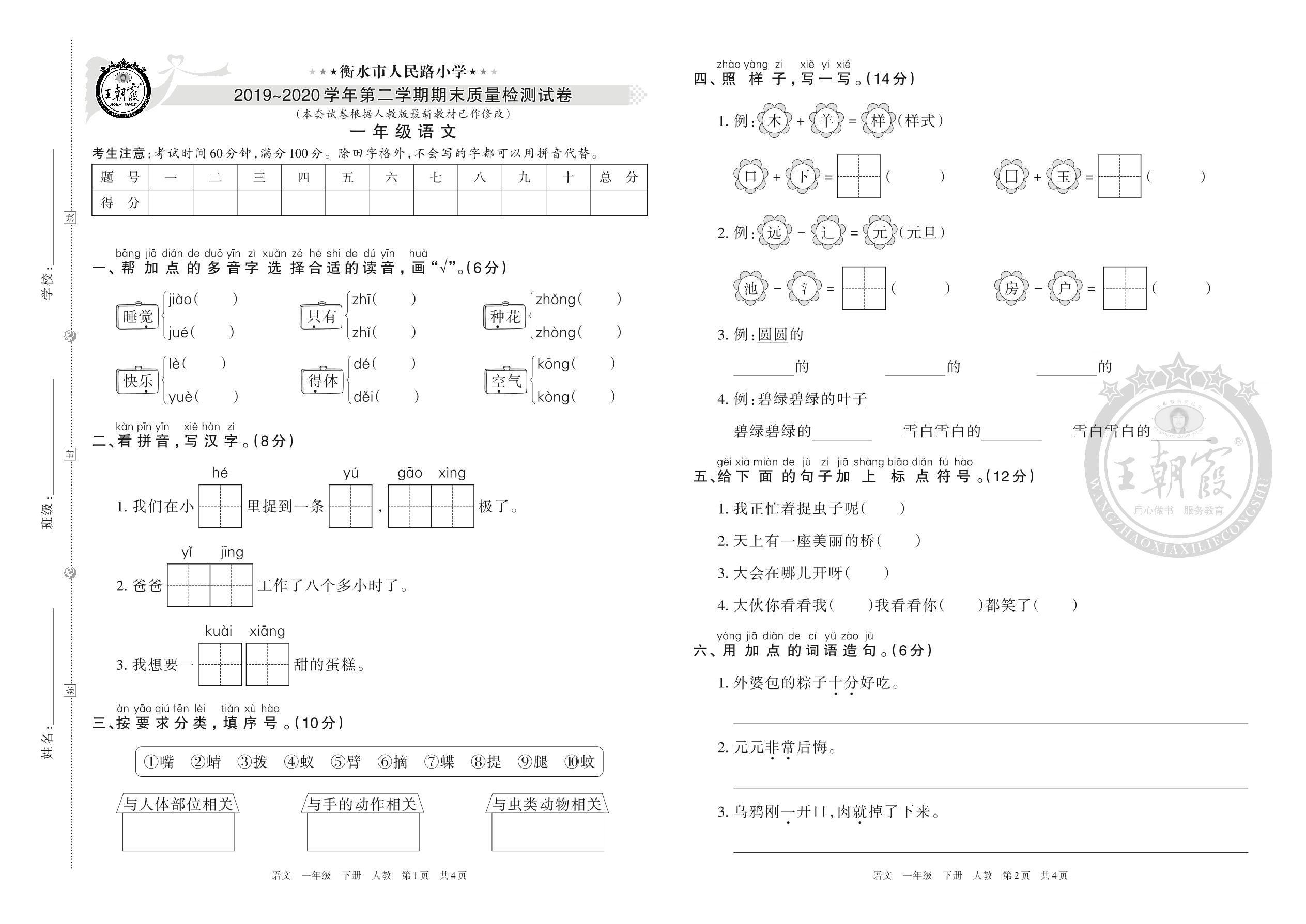 衡水市人民路小学2019~2020学年第二学期期末质量检测试卷一年级语文(人教版)