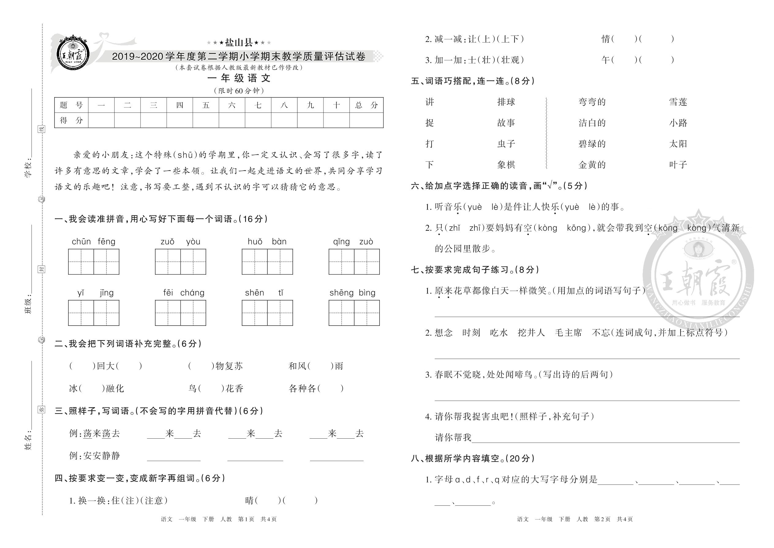 盐山县2019~2020学年度第二学期期末教学质量评估试卷一年级语文(人教版)
