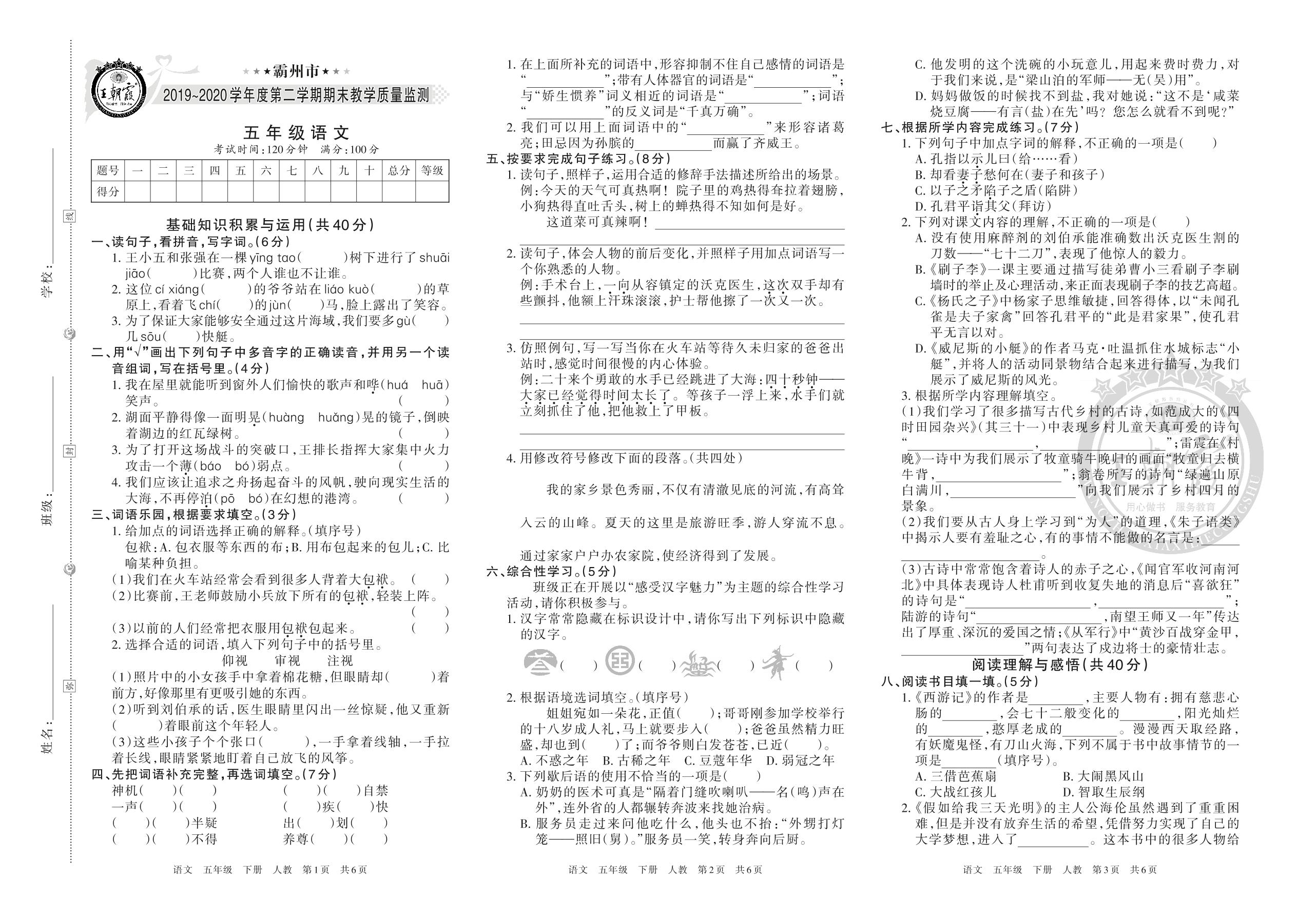 霸州市2019-2020学年度第二学期期末教学质量监测五年级语文(人教版)