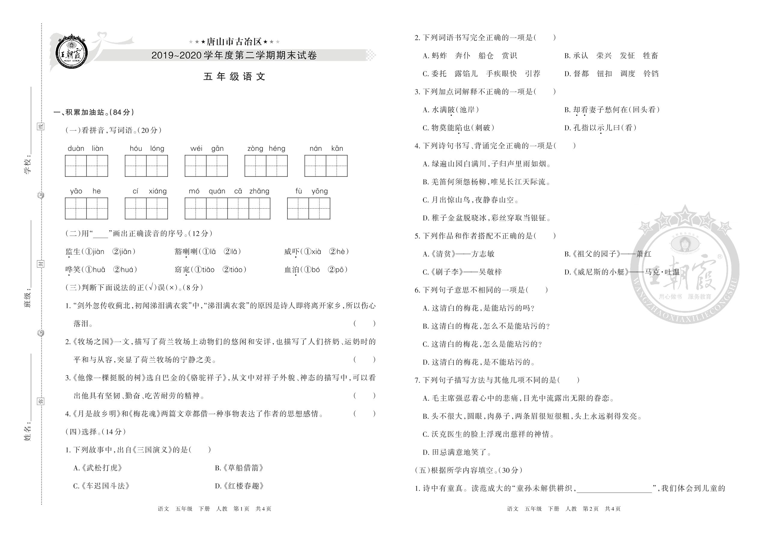 唐山市古治区2019-2020学年度第二学期期末试卷五年级语文(人教版)