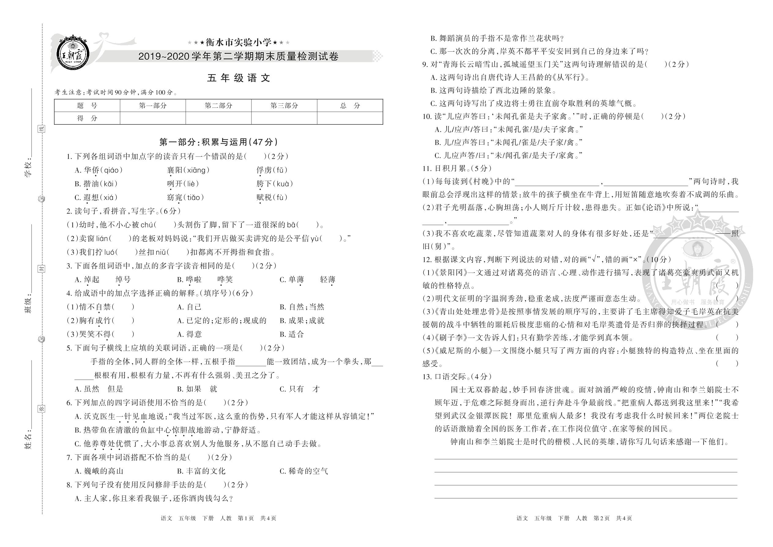 衡水市实验小学2019-~2020学年第二学期期末质量检测试卷五年级语文(人教版)