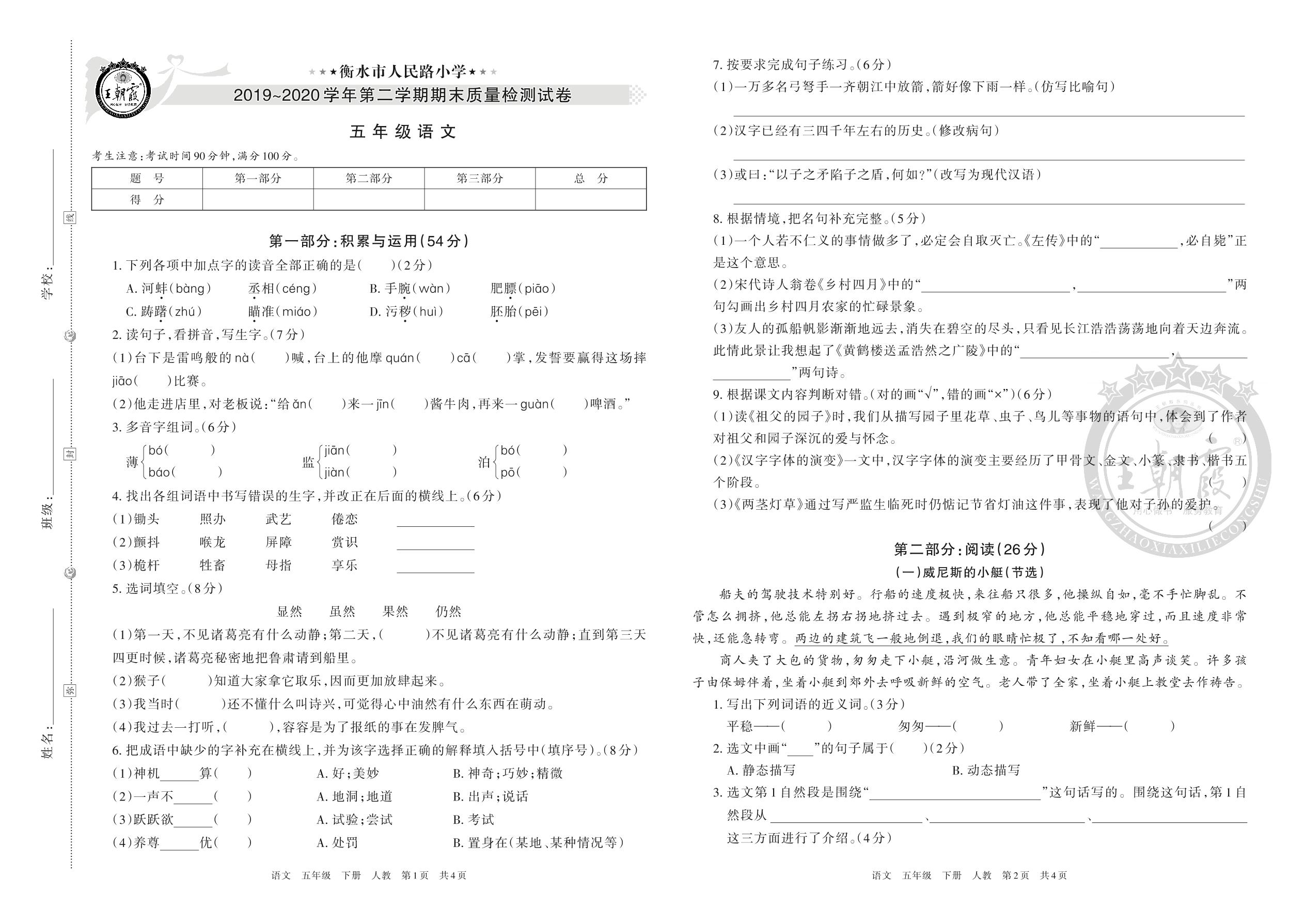 衡水市人民路小学2019-2020学年第二学期期末质量检测试卷五年级语文(人教版)