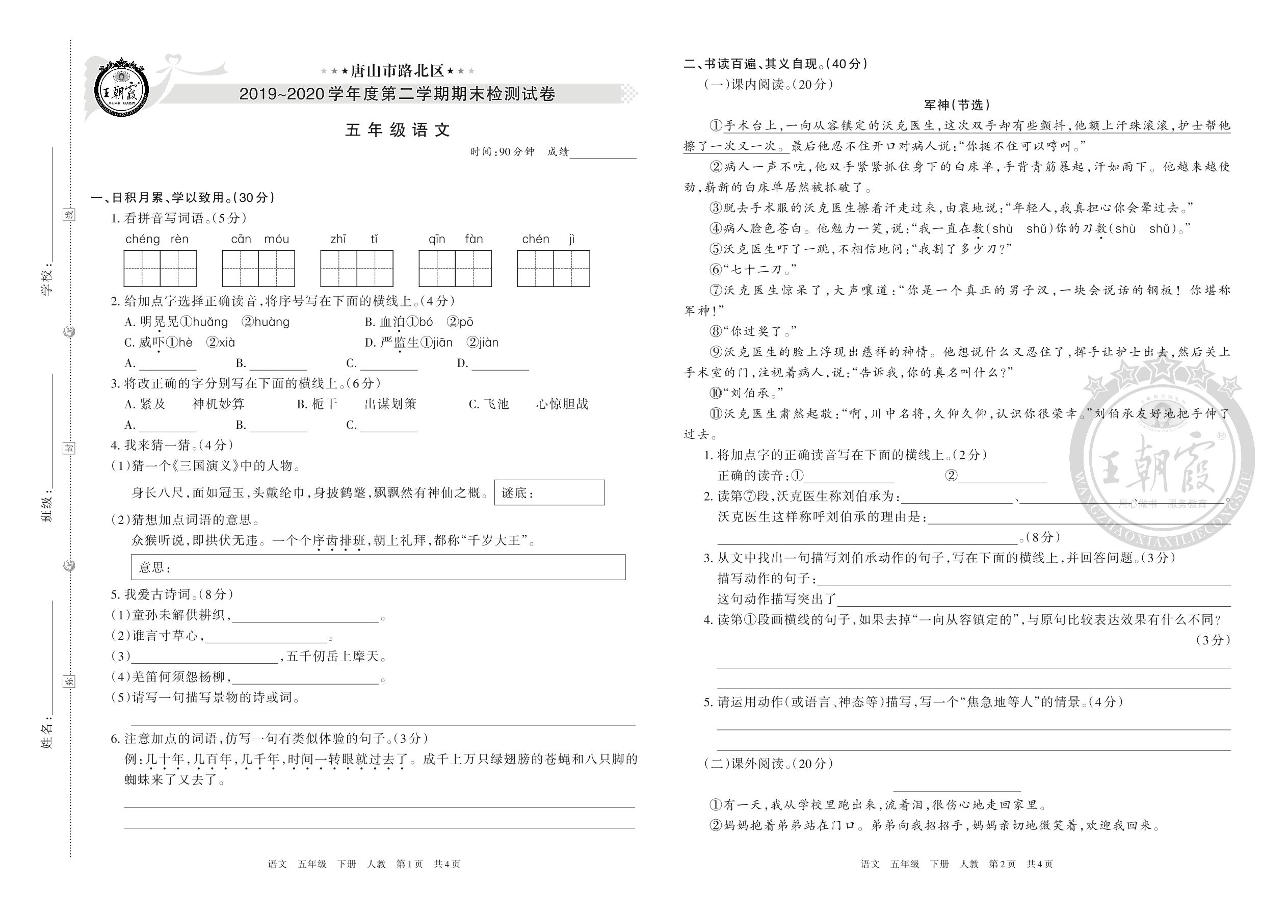 唐山路北区2019-2020学年度第二学期期末检测试卷五年级语文(人教版)