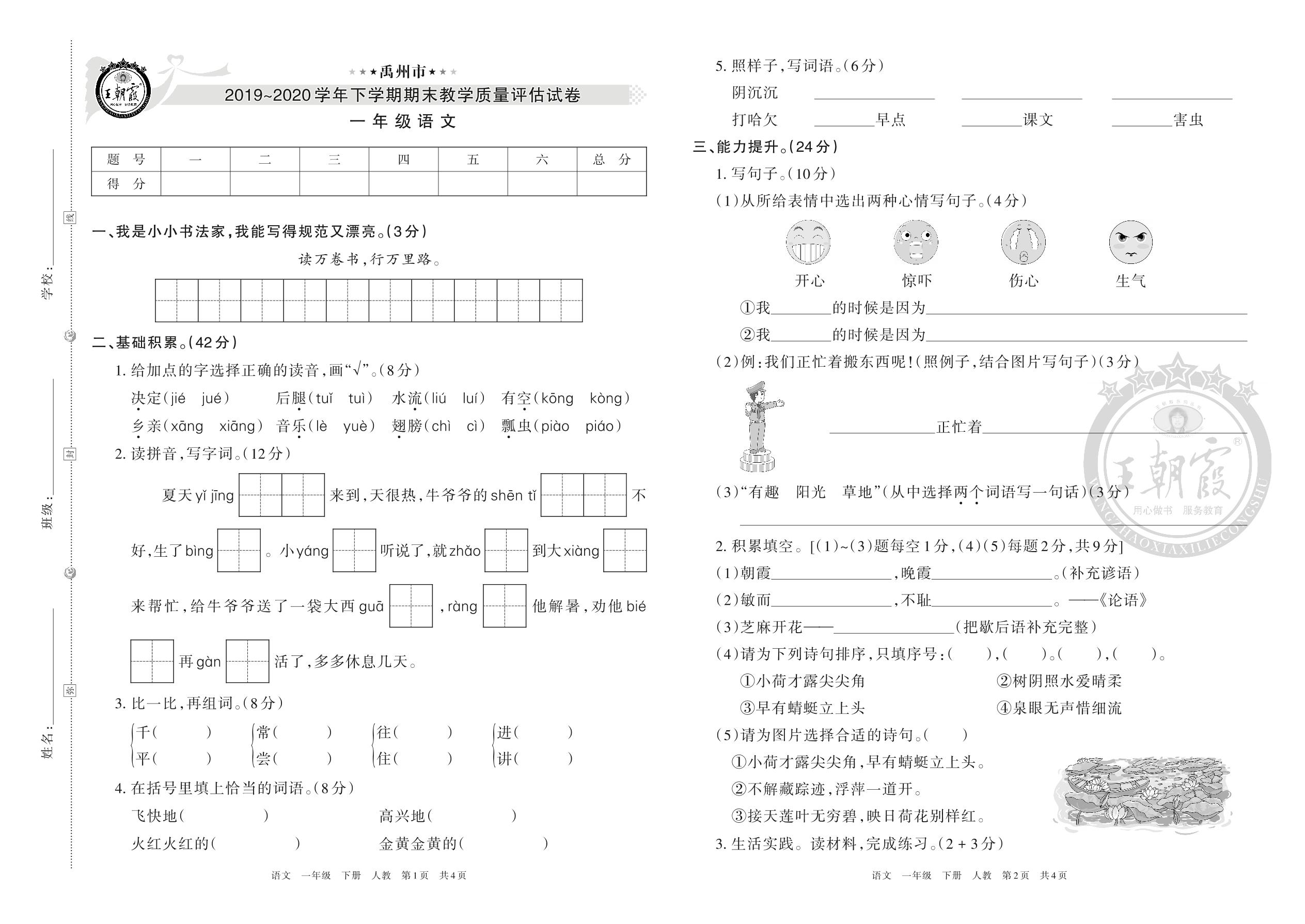 禹州市2019-2020学年下学期期末教学质量评估试卷一年级语文(人教版)