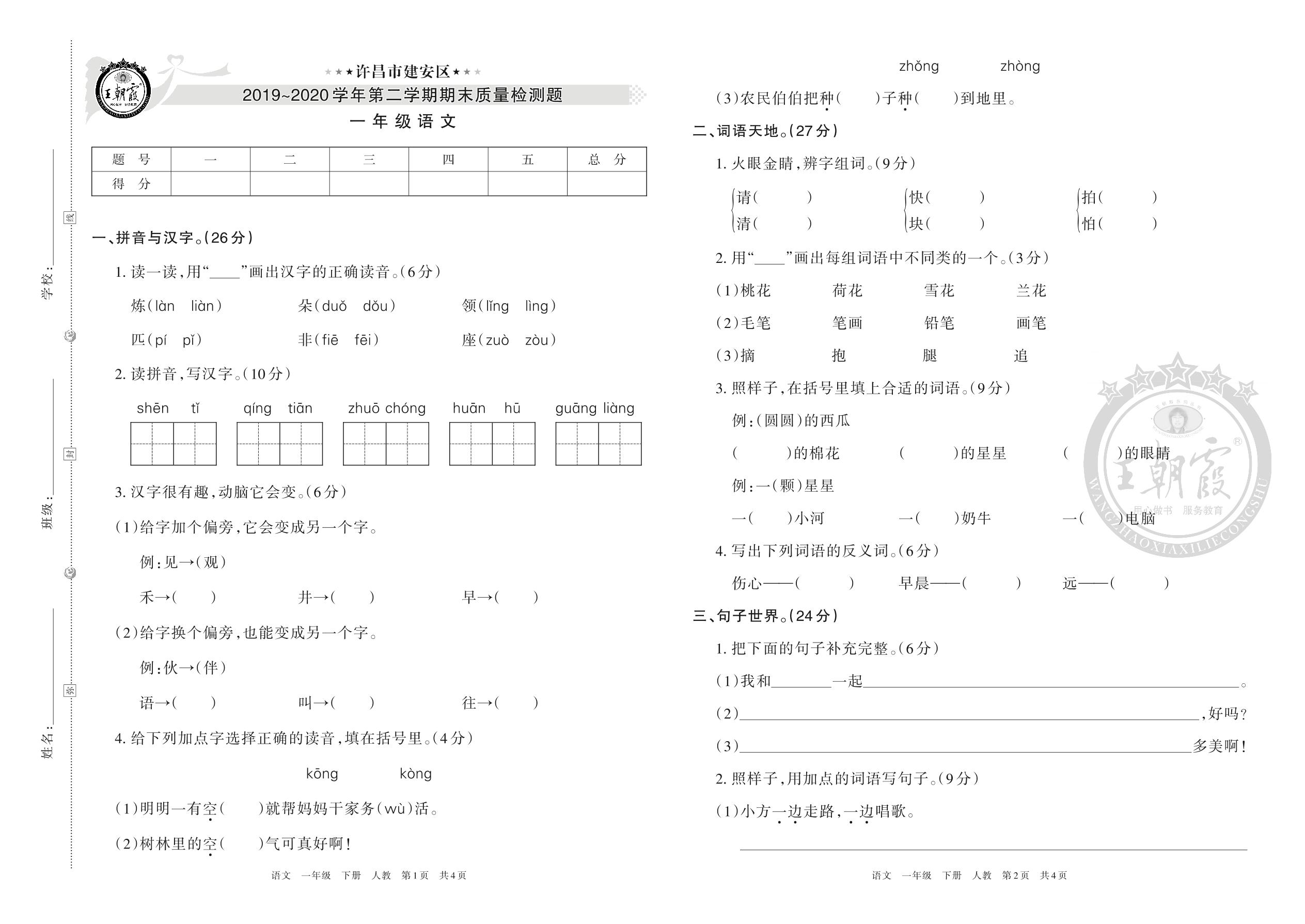 许昌市建安区2019-2020学年第二学期期末质量检测题一年级语文(人教版)