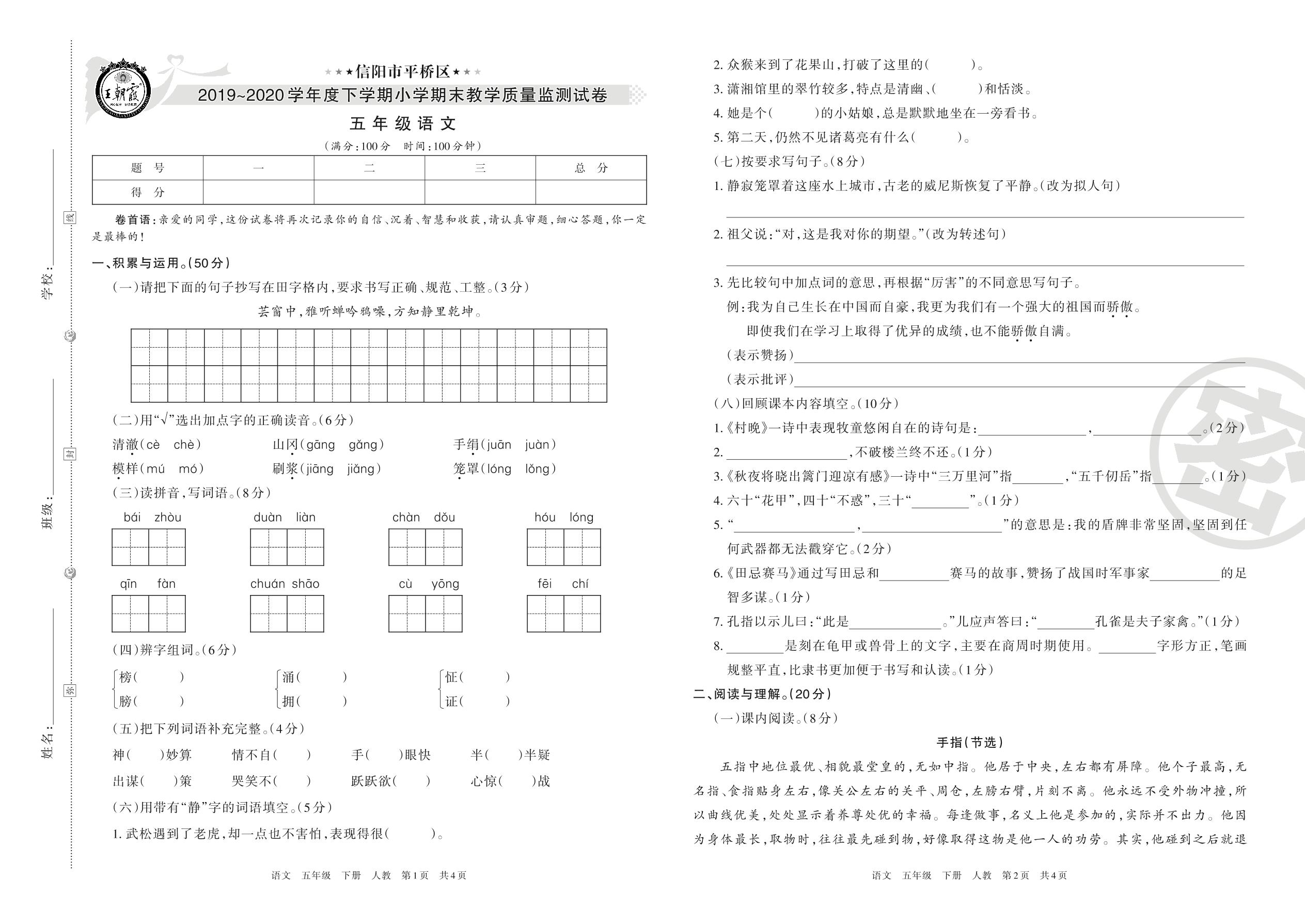 信阳市平桥区2019-2020学年度下学期小学期末教学质量监测试卷五年级语文(人教版)