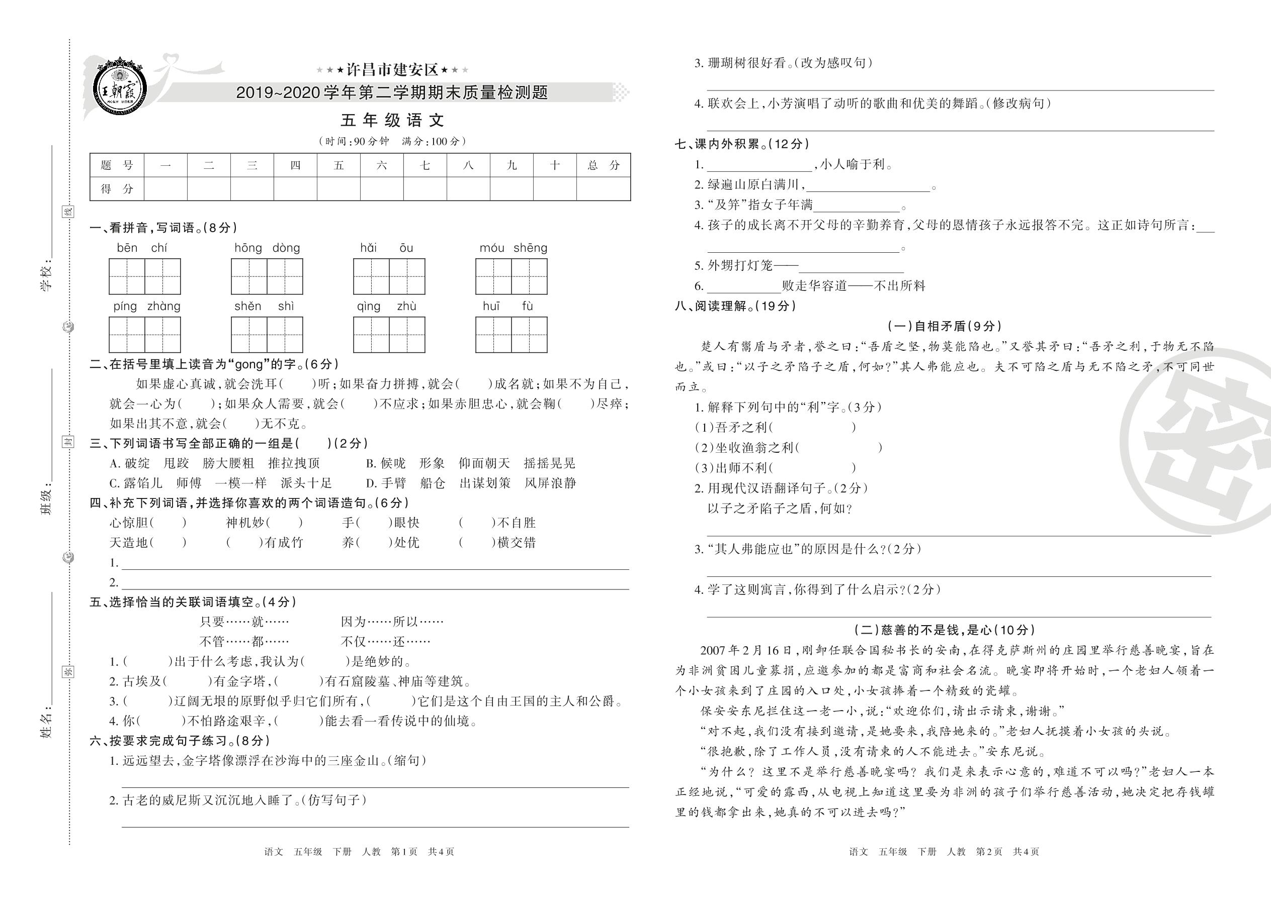 许昌市建安区2019-2020学年第二学期期末质量检测题五年级语文(人教版)