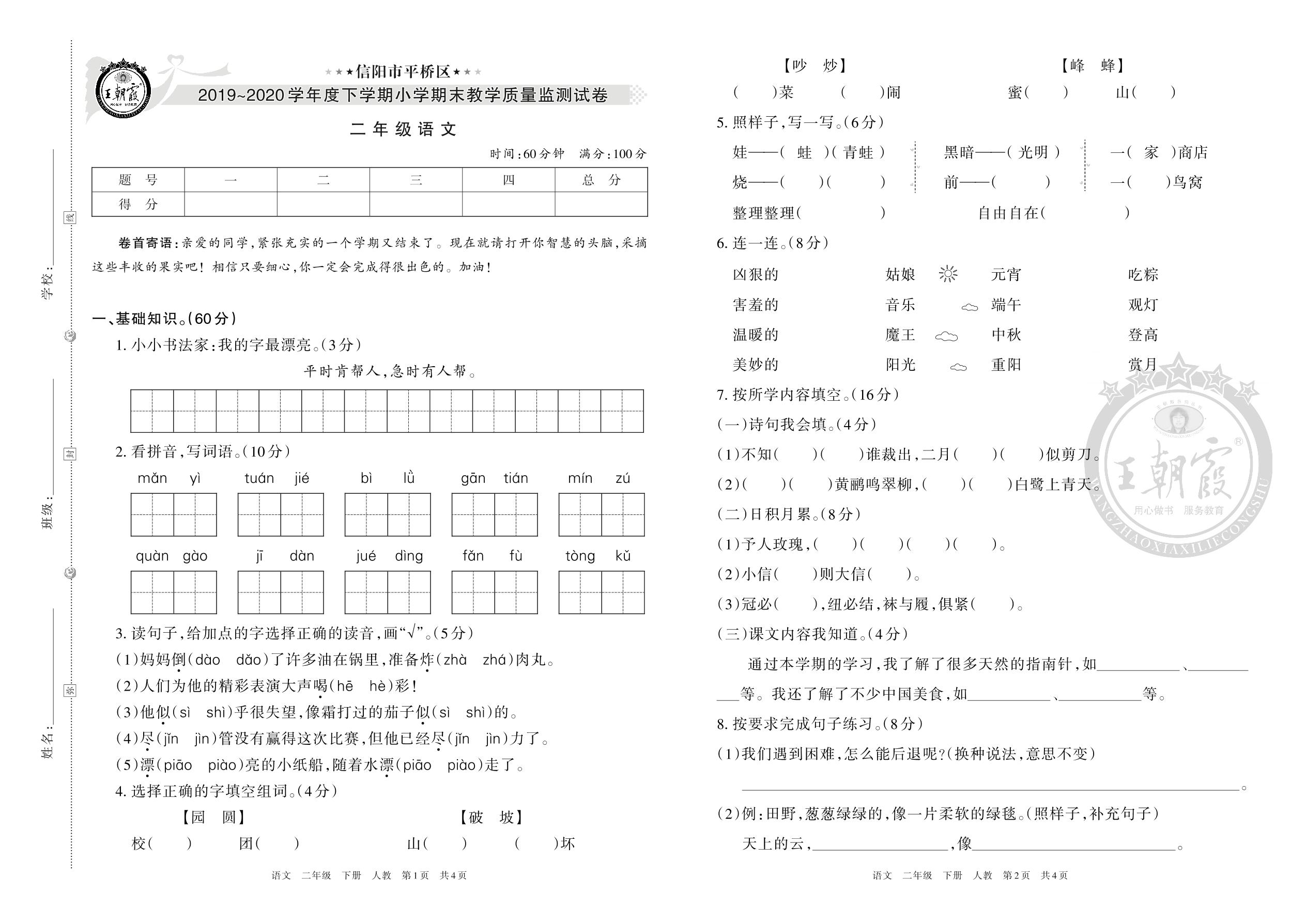信阳市平桥区2019-2020学年度下学期小学期末教学质量监测试卷二年级语文(人教版)