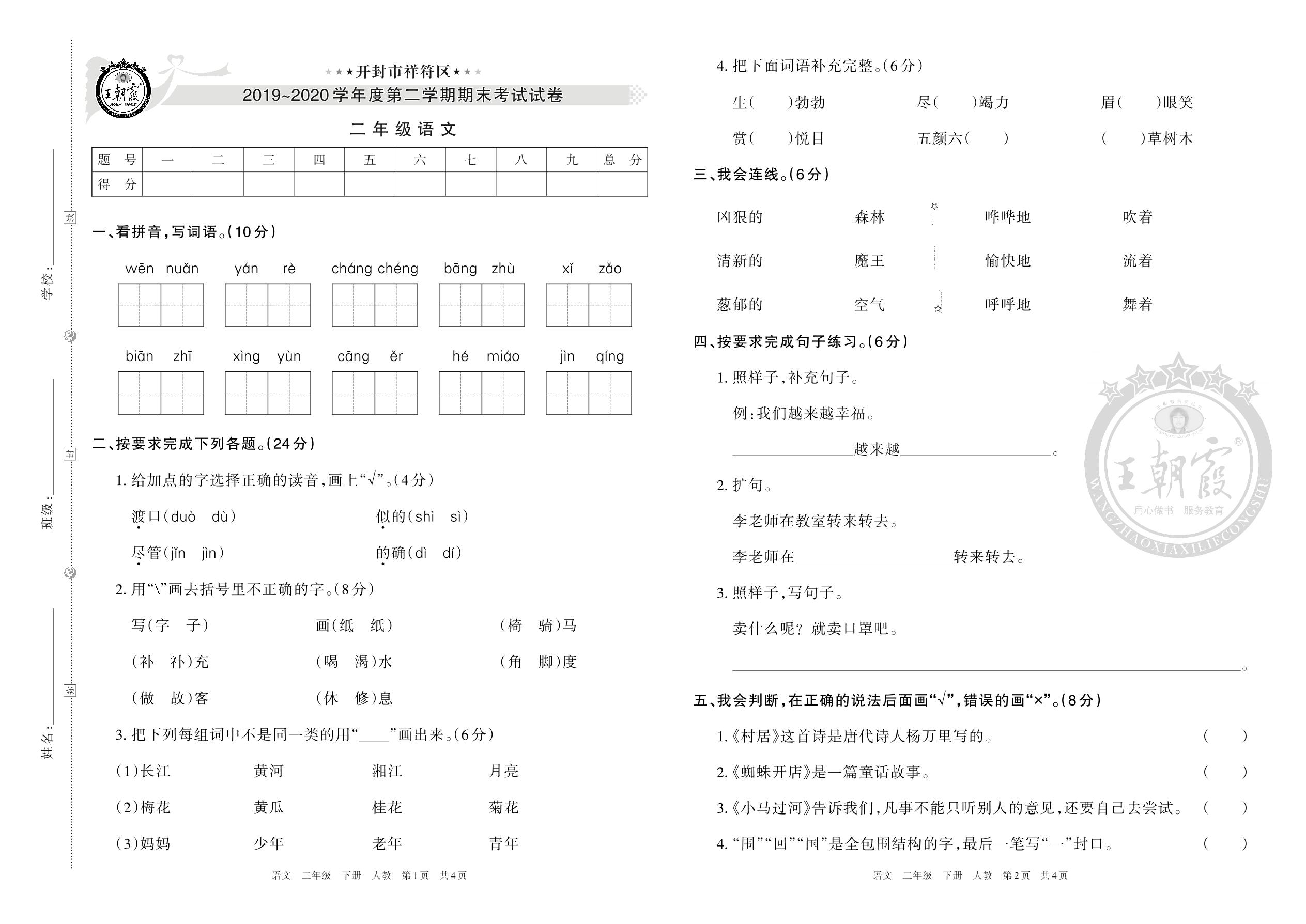 开封市祥符区2019-2020学年度第二学期期末考试试卷二年级语文(人教版)