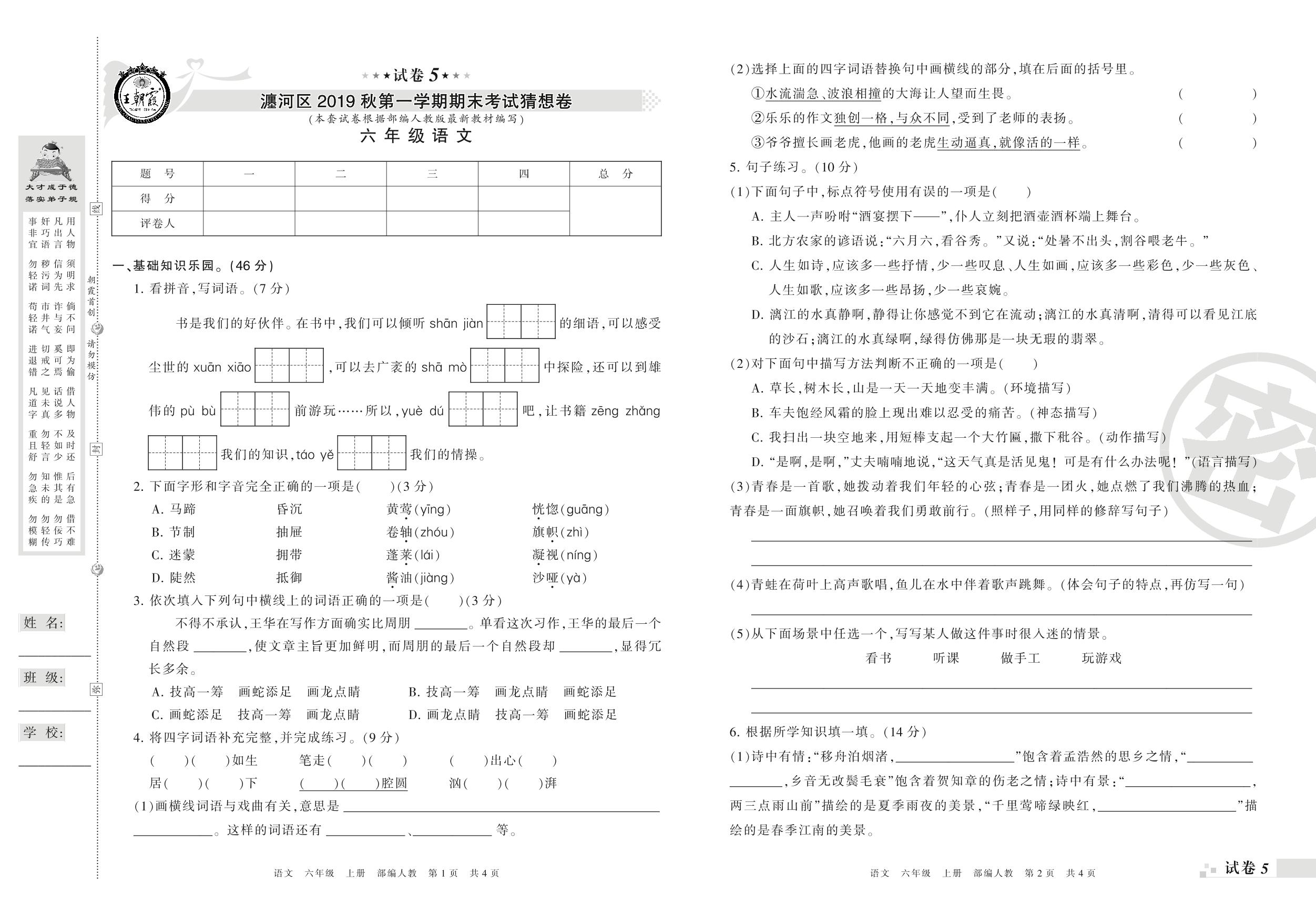 2019-2020学年第一学期洛阳市瀍河区猜想卷六年级语文试卷(人教版)【5】