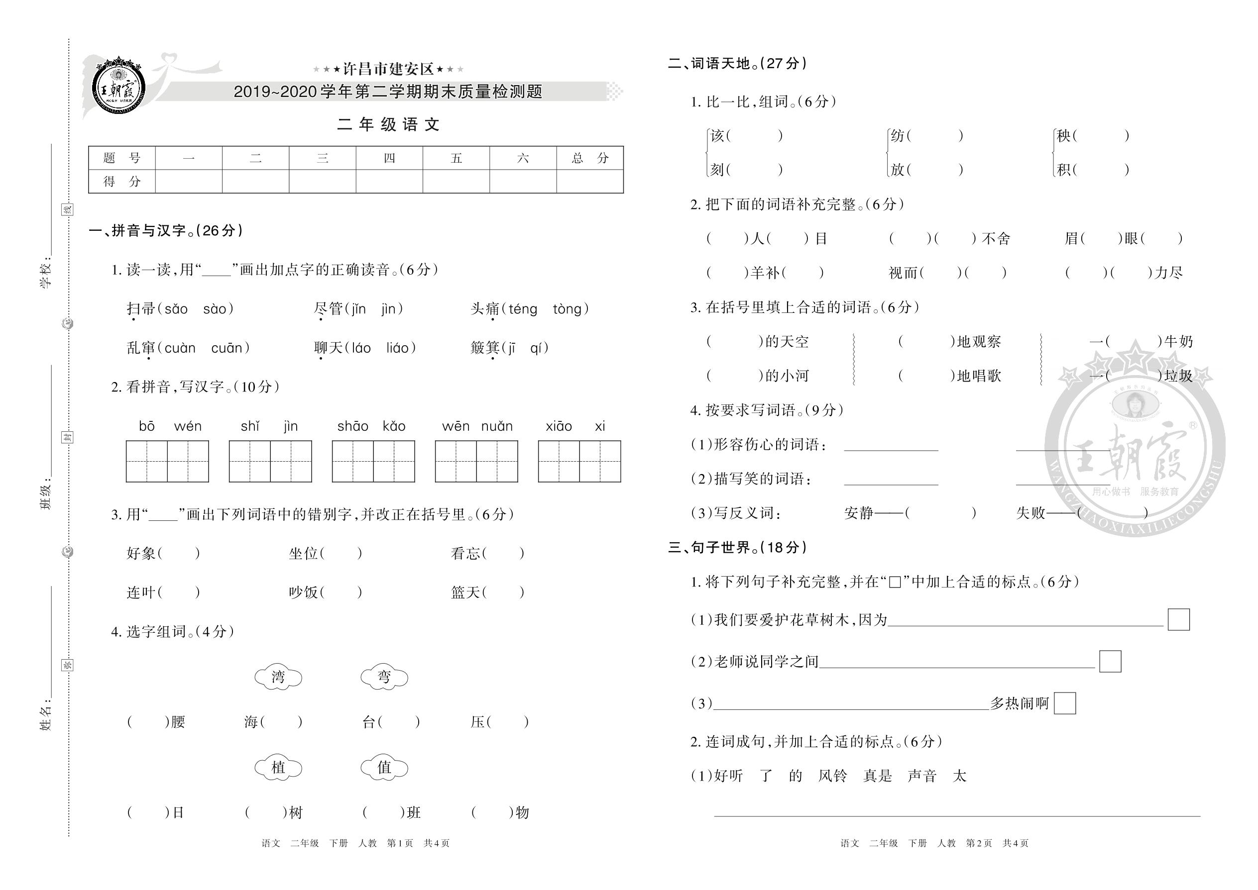 许昌市建安区2019-2020学年第二学期期末质量检测题二年级语文(人教版)