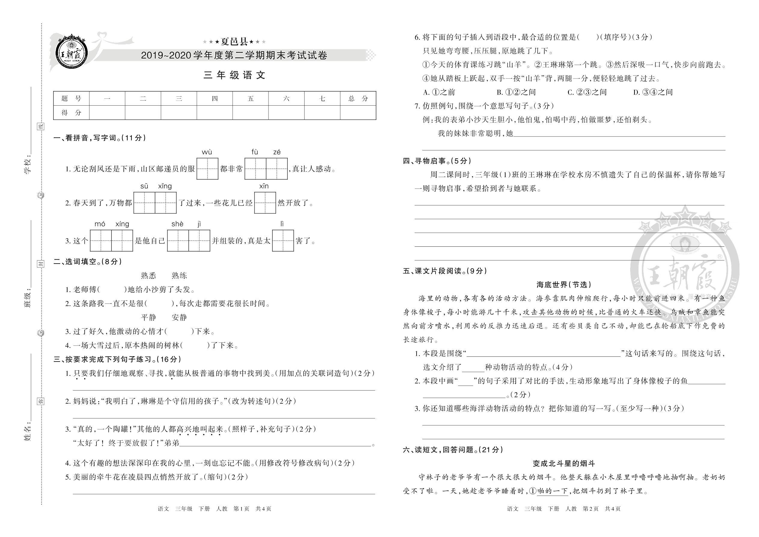 夏邑县2019-2020学年度第二学期期末考试试卷三年级语文(人教版)