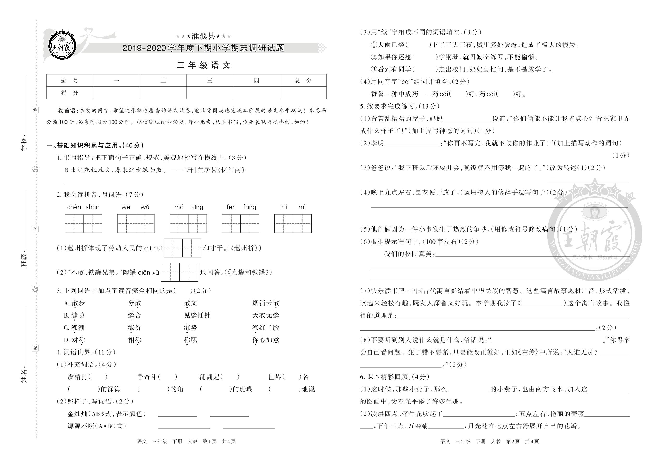 淮滨县2019~2020学年度下期小学期末调研试题三年级语文(人教版)