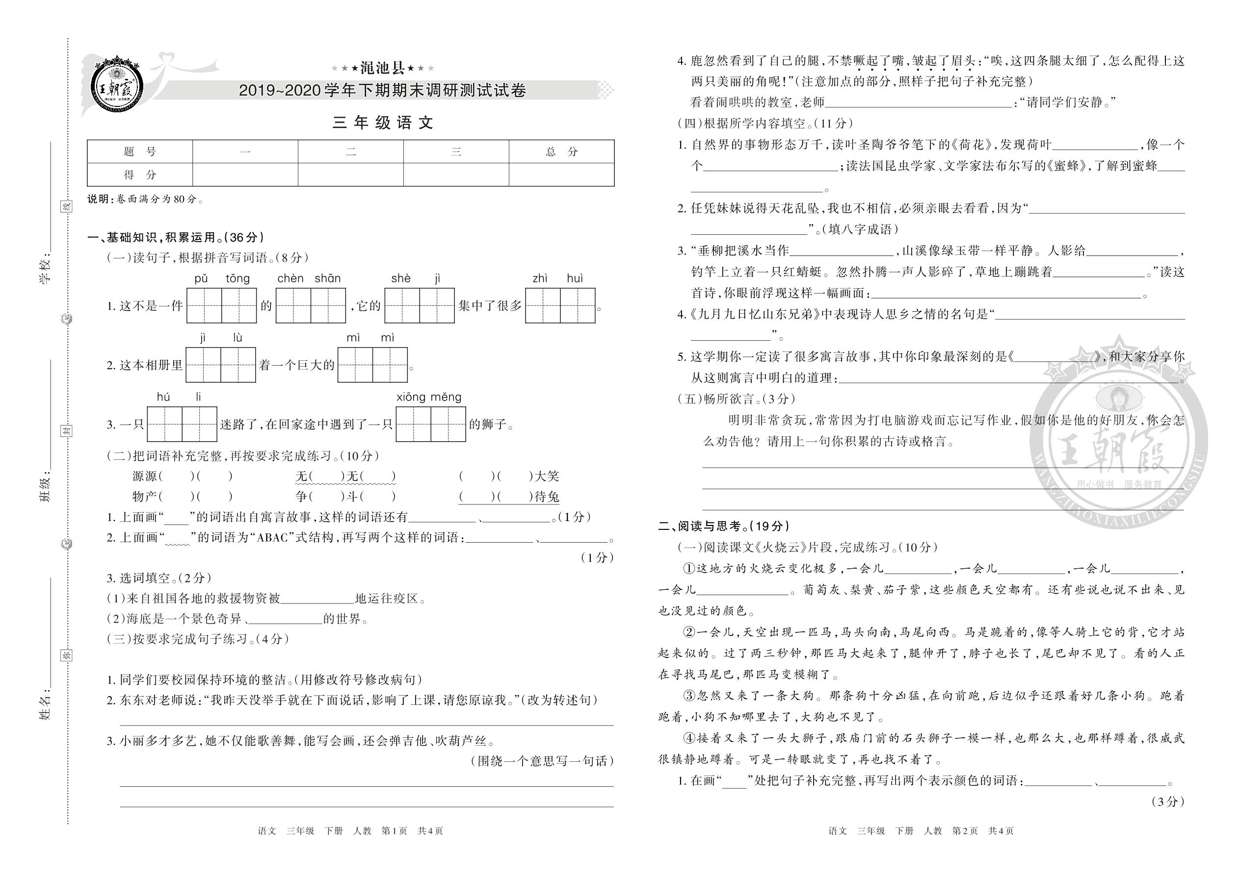 渑池县2019~2020学年下期期末调研测试试卷三年级语文(人教版)