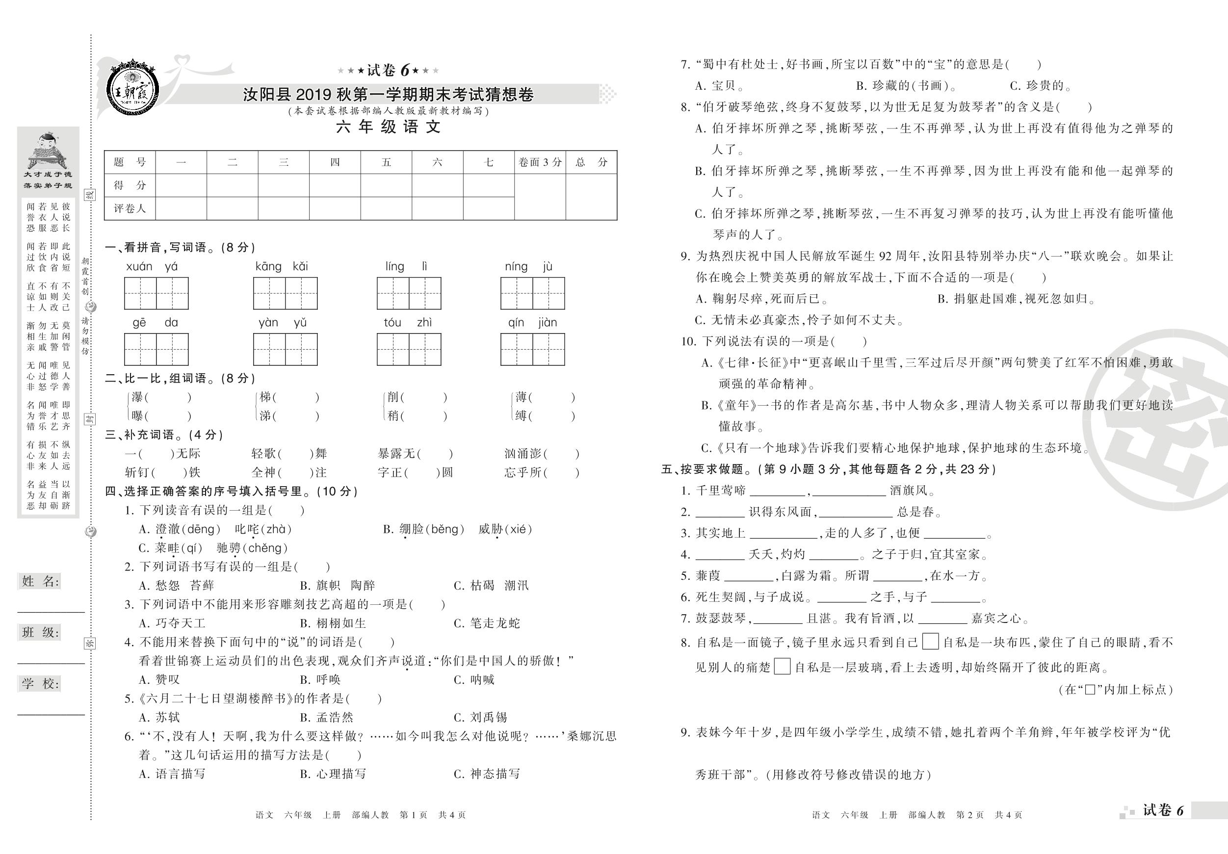 2019-2020学年第一学期洛阳市汝阳县猜想卷六年级语文试卷(人教版)【6】