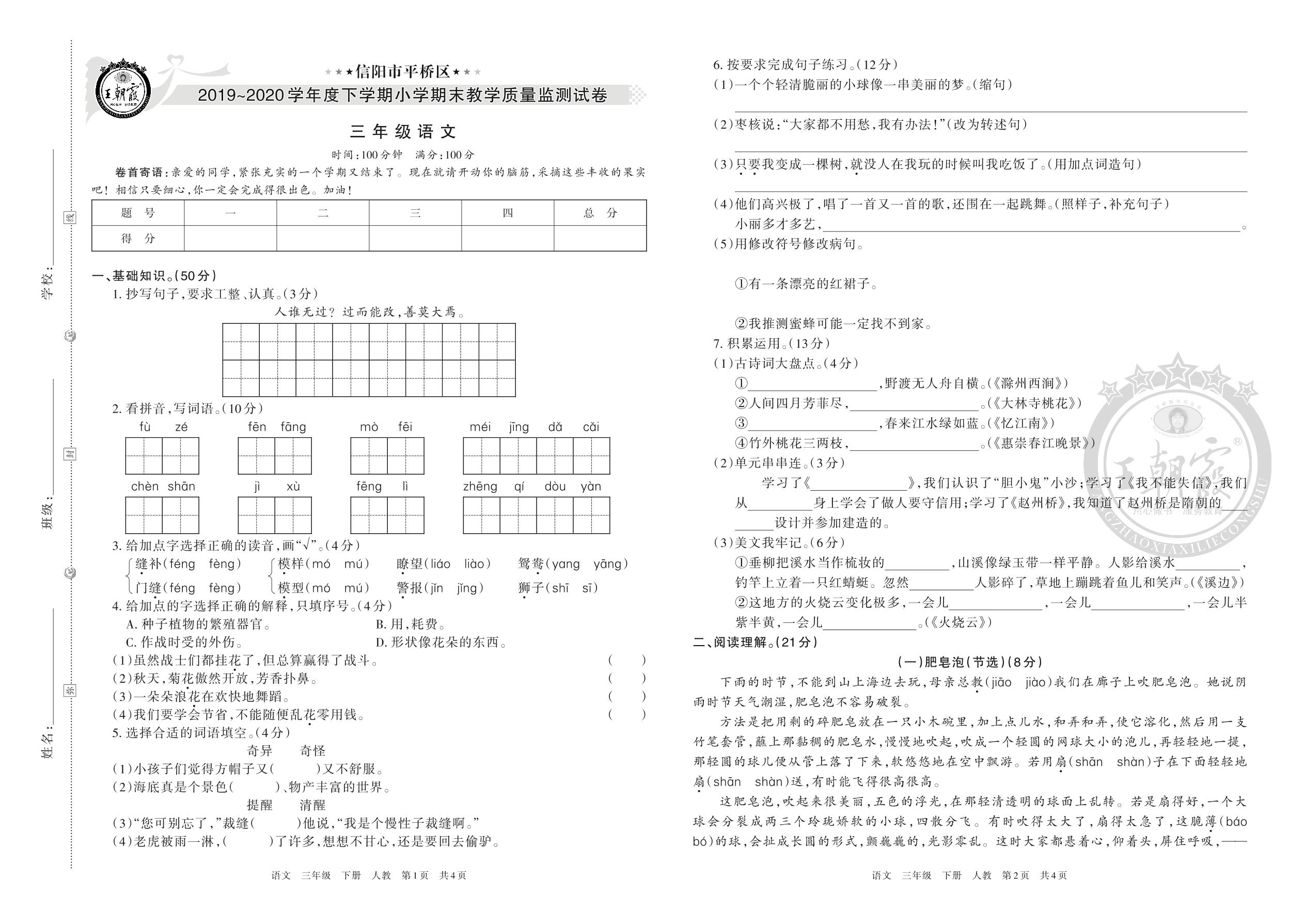 信阳市平桥区2019-2020学年度下学期小学期未教学质量监测试卷三年级语文(人教版)