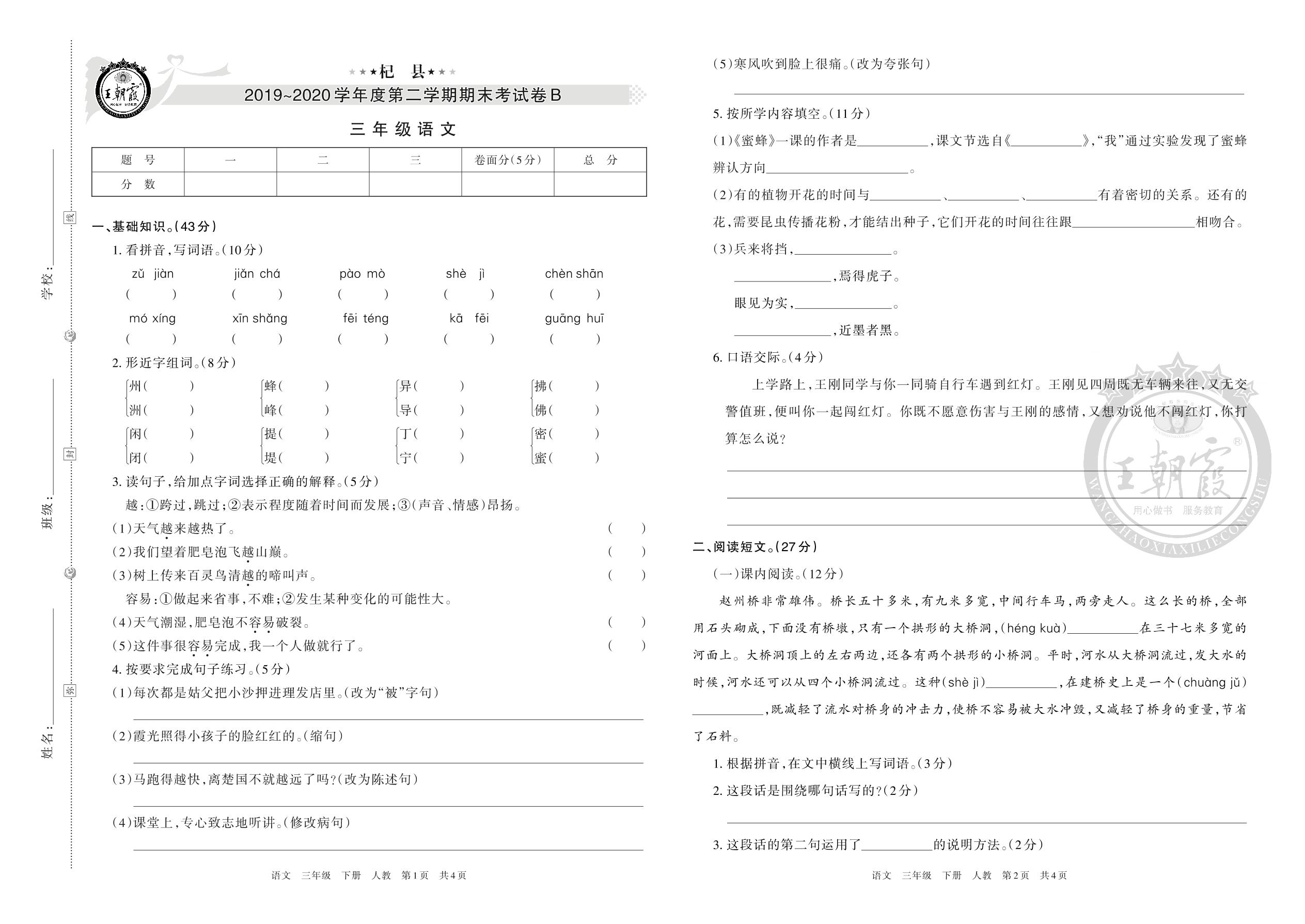 杞县2019~2020学年度第二学期期末考试卷B三年级语文(人教版)