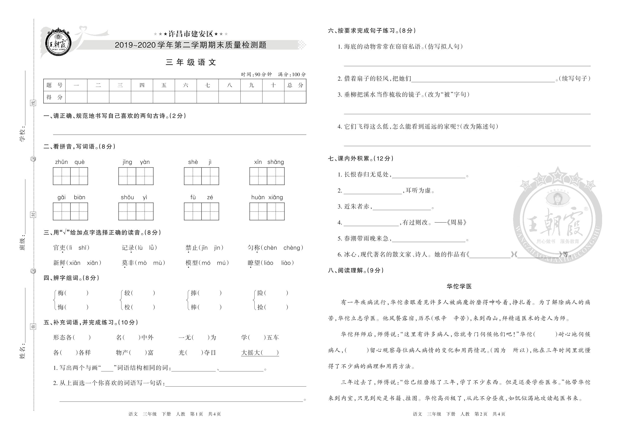 许昌市建安区2019-2020学年第二学期期末质量检测题三年级语文(人教版)