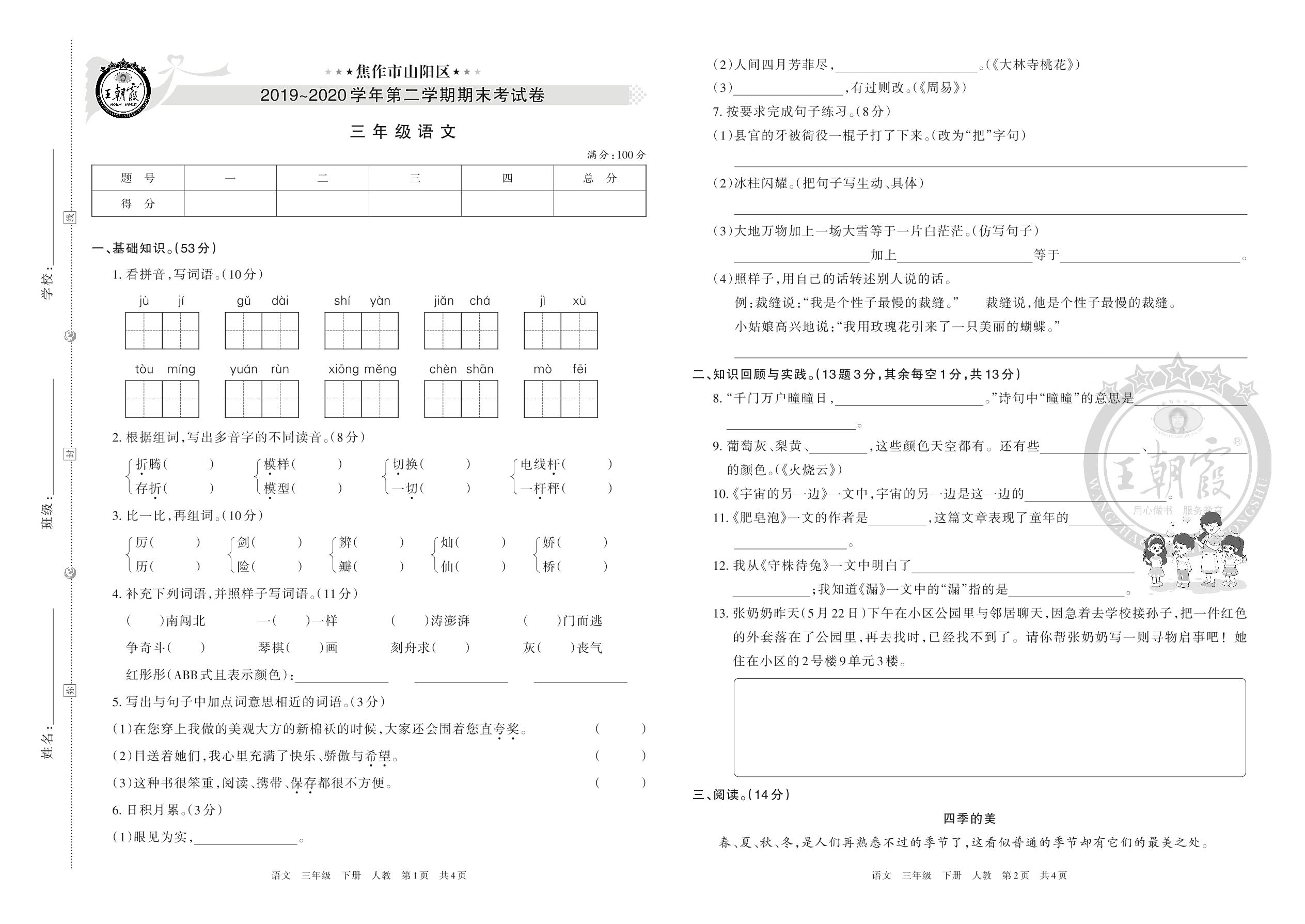 焦作市山阳区2019~2020学年第二学期期末考试卷三年级语文(人教版)