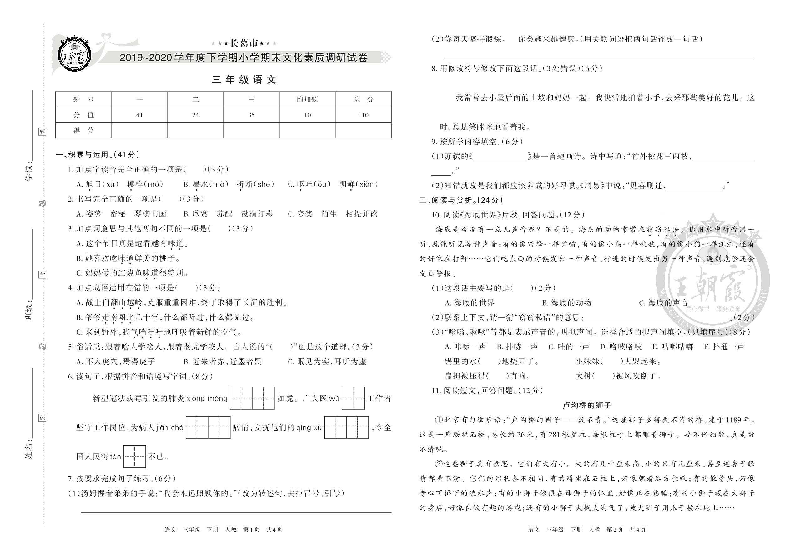 长葛市2019-2020学年度下学期小学期未文化素质调研试卷三年级语文(人教版)