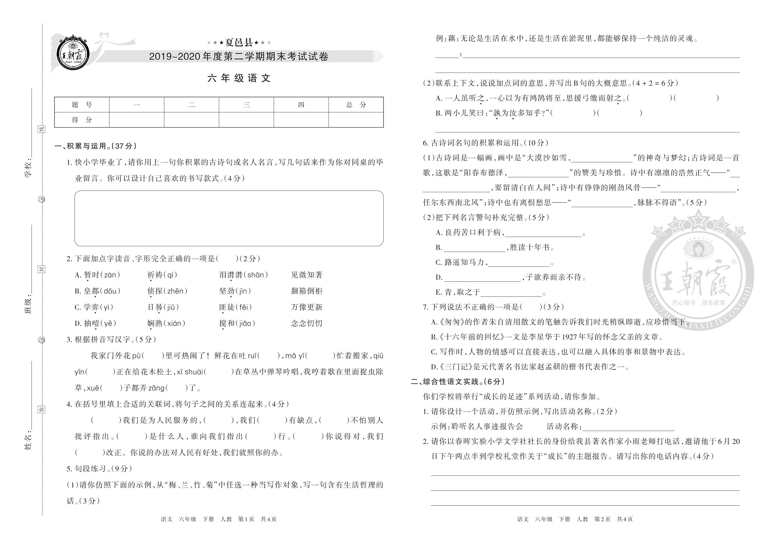 夏邑县2019~2020年度第二学期期末考试试卷六年级语文人教版(人教版)