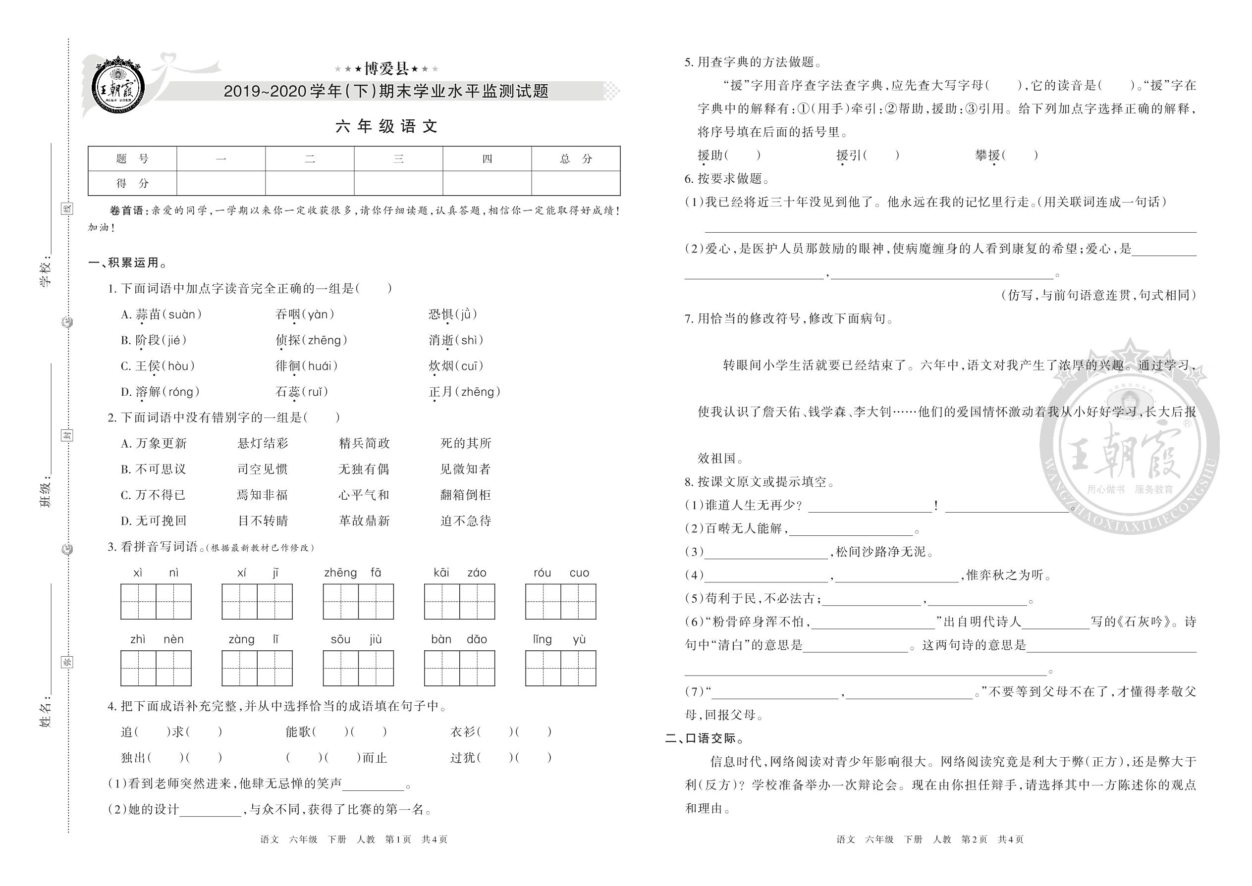 博爱县2019~2020学年(下)期末六年级学业水平监测试题六年级语文人教版(人教版)