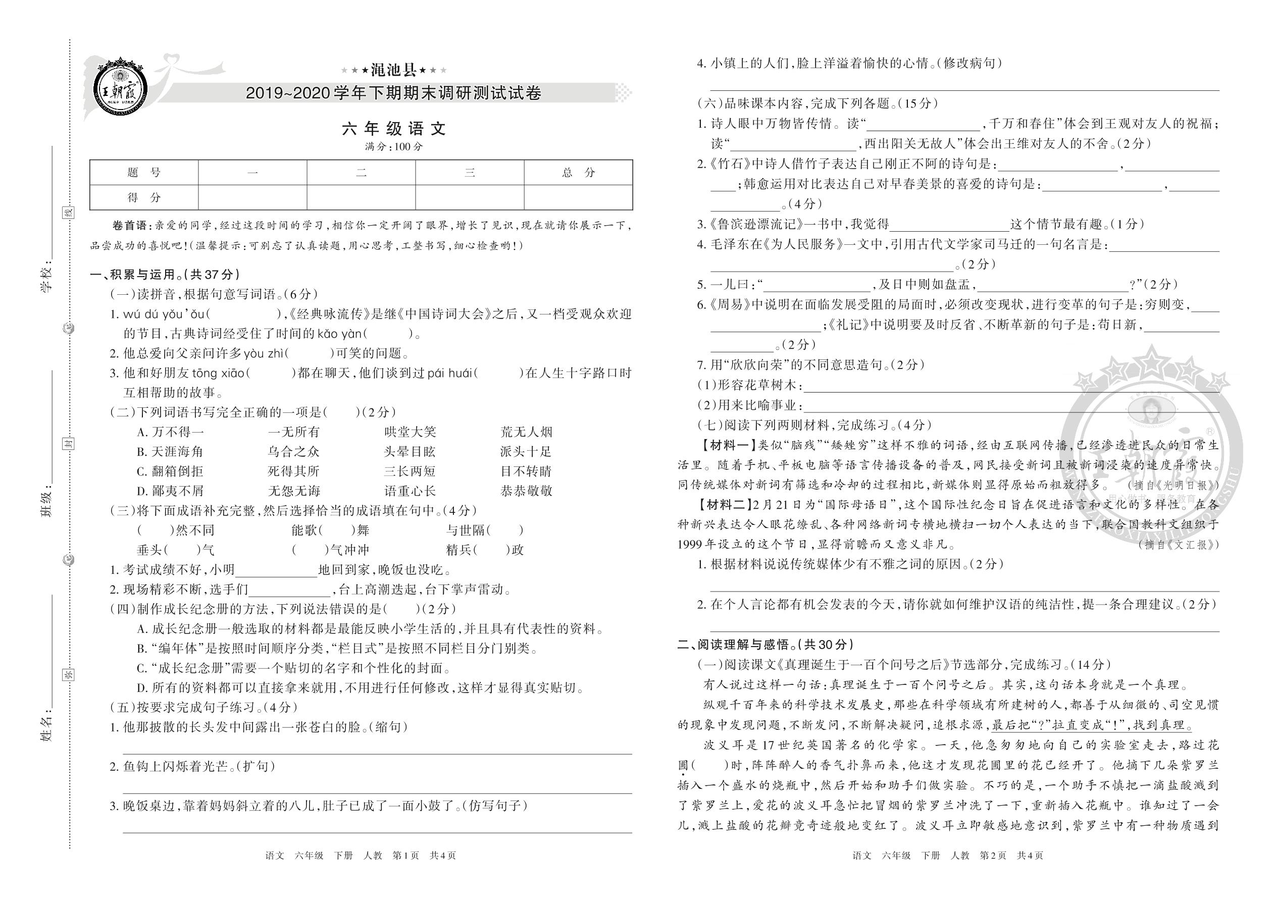 渑池县2019~2020学年下期期末调研测试试卷六年级语文人教版(人教版)