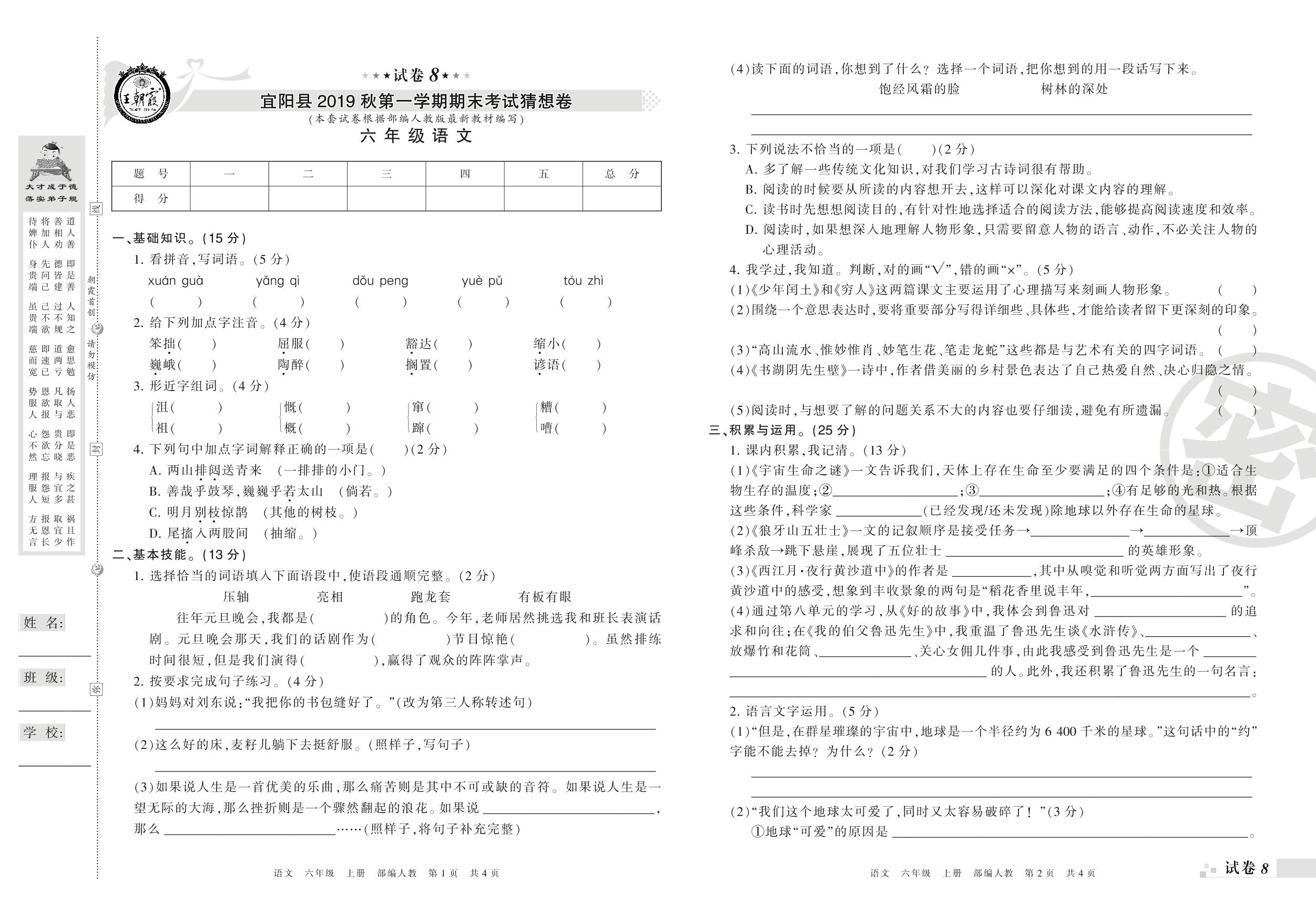 2019-2020学年第一学期洛阳市宜阳县猜想卷六年级语文试卷(人教版)【8】