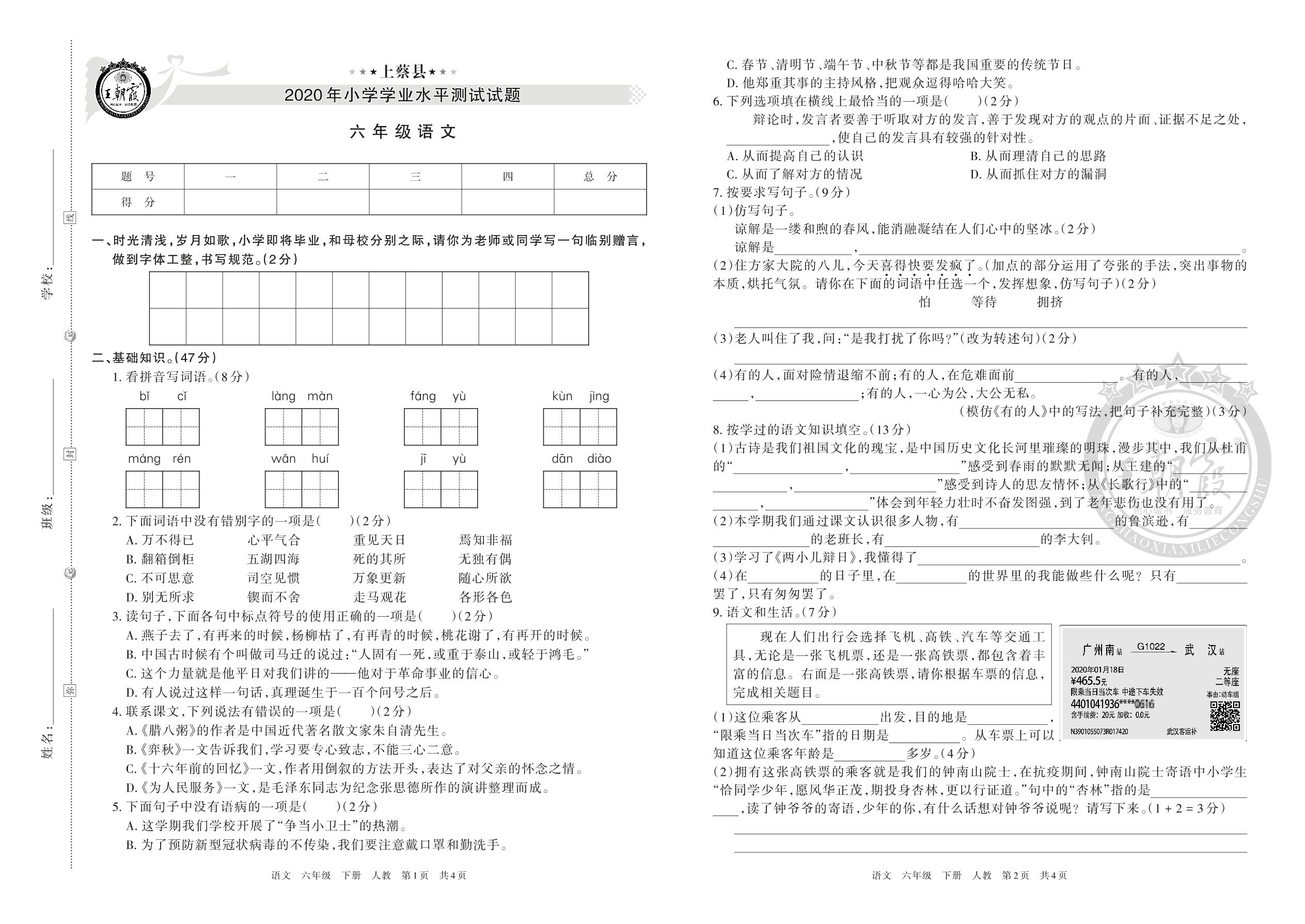 上蔡县2020年小学学业水平测试试题六年级语文人教版(人教版)