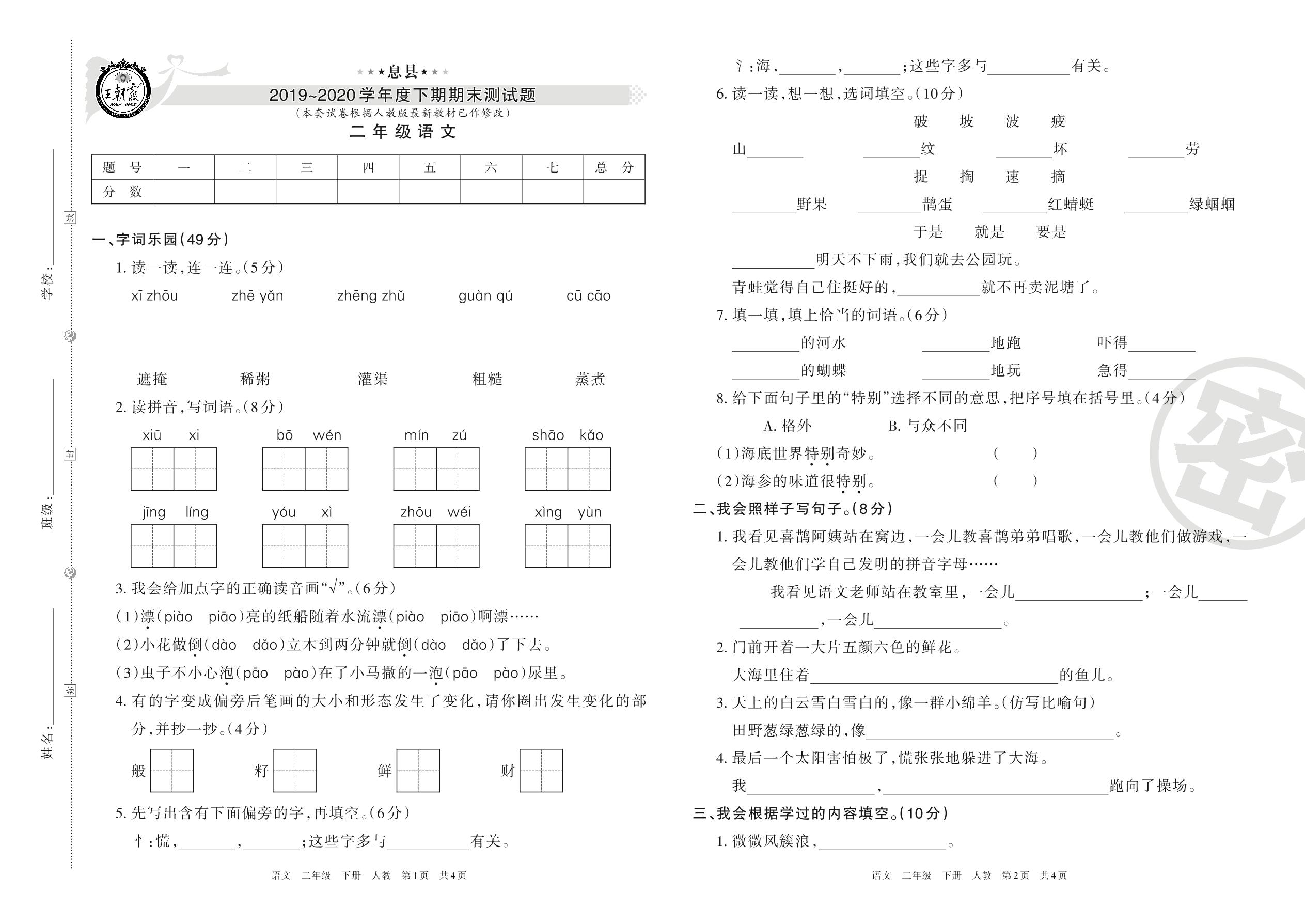 二年级语文人教版下册期末卷