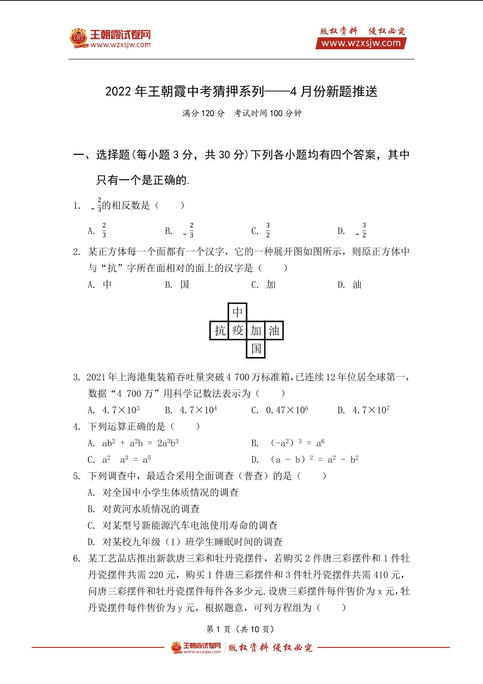 【数学】2022年王朝霞中考猜押系列——4月份新题推送