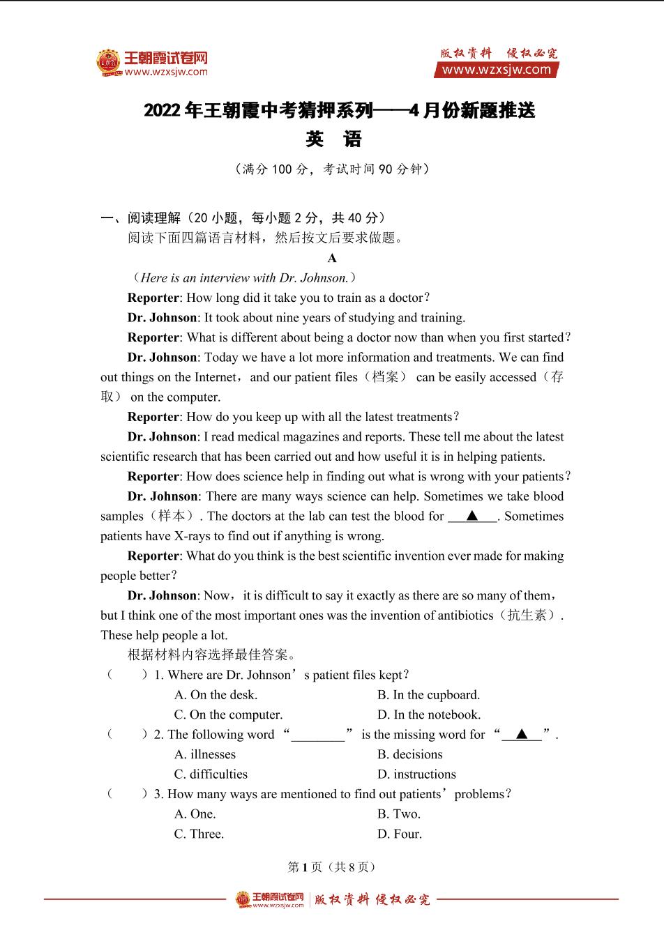 【英语】2022年王朝霞中考猜押系列——4月份新题推送