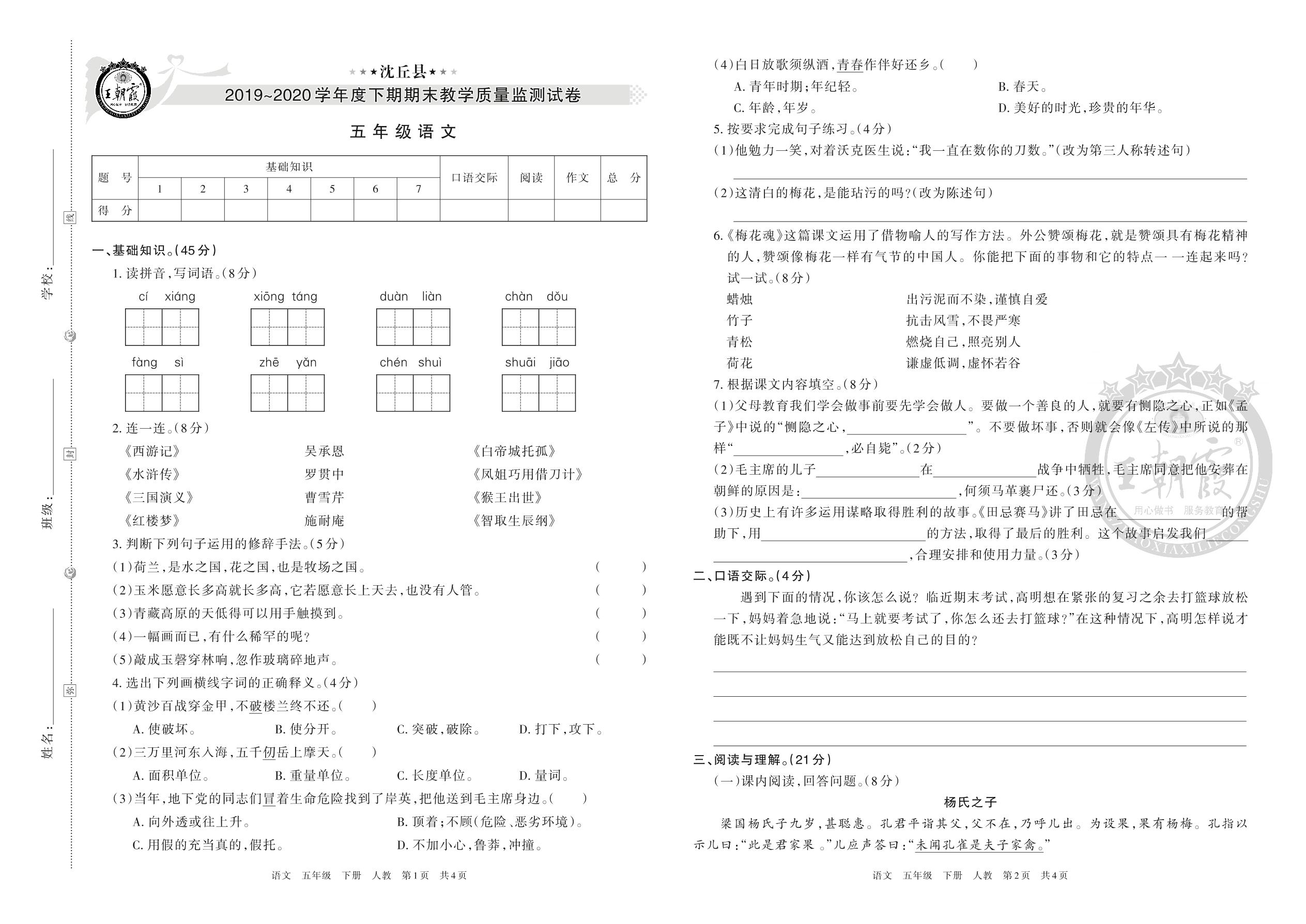 沈丘县2019-2020学年度下期期末教学质量监测试卷五年级语文(人教版)