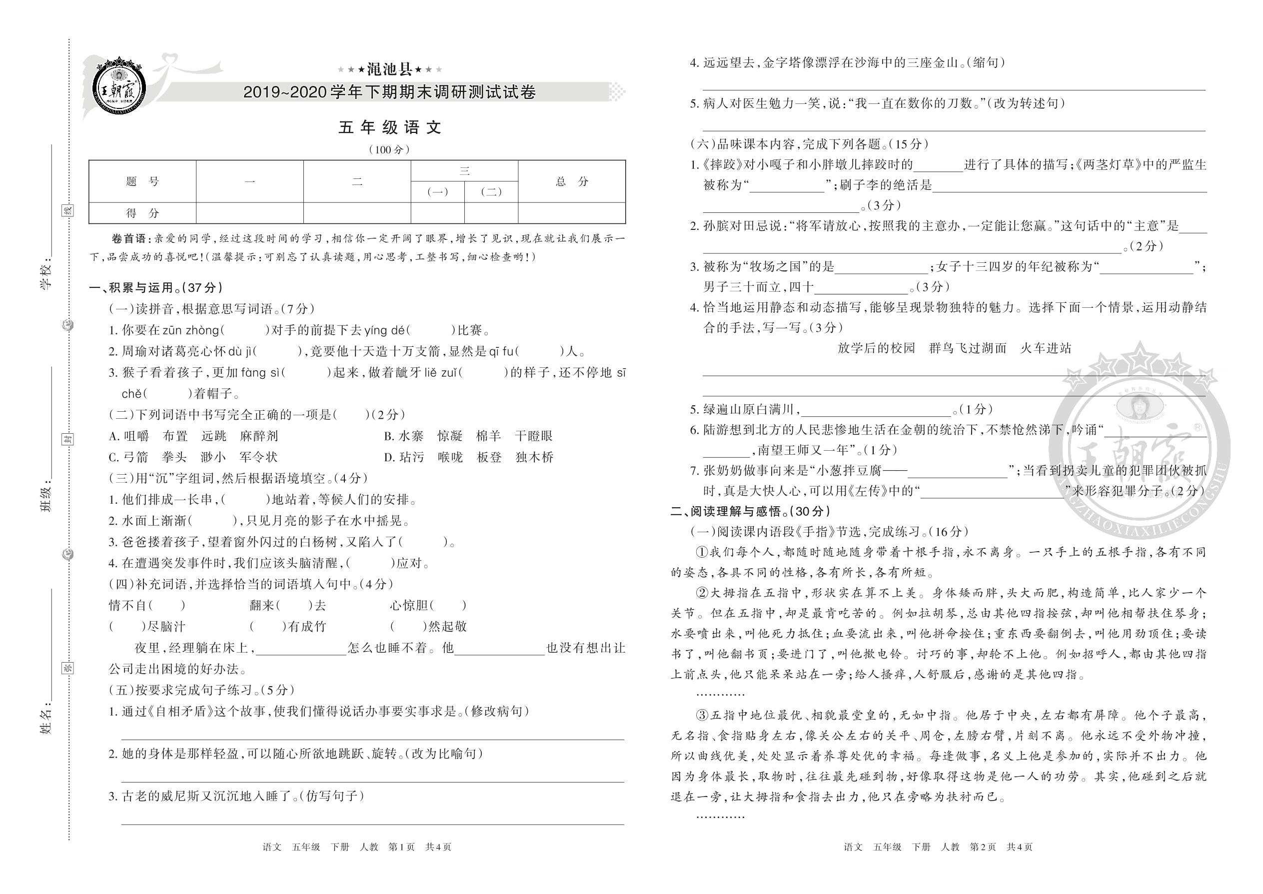渑池县2019~2020学年下期期末调研测试试卷五年级语文(人教版)