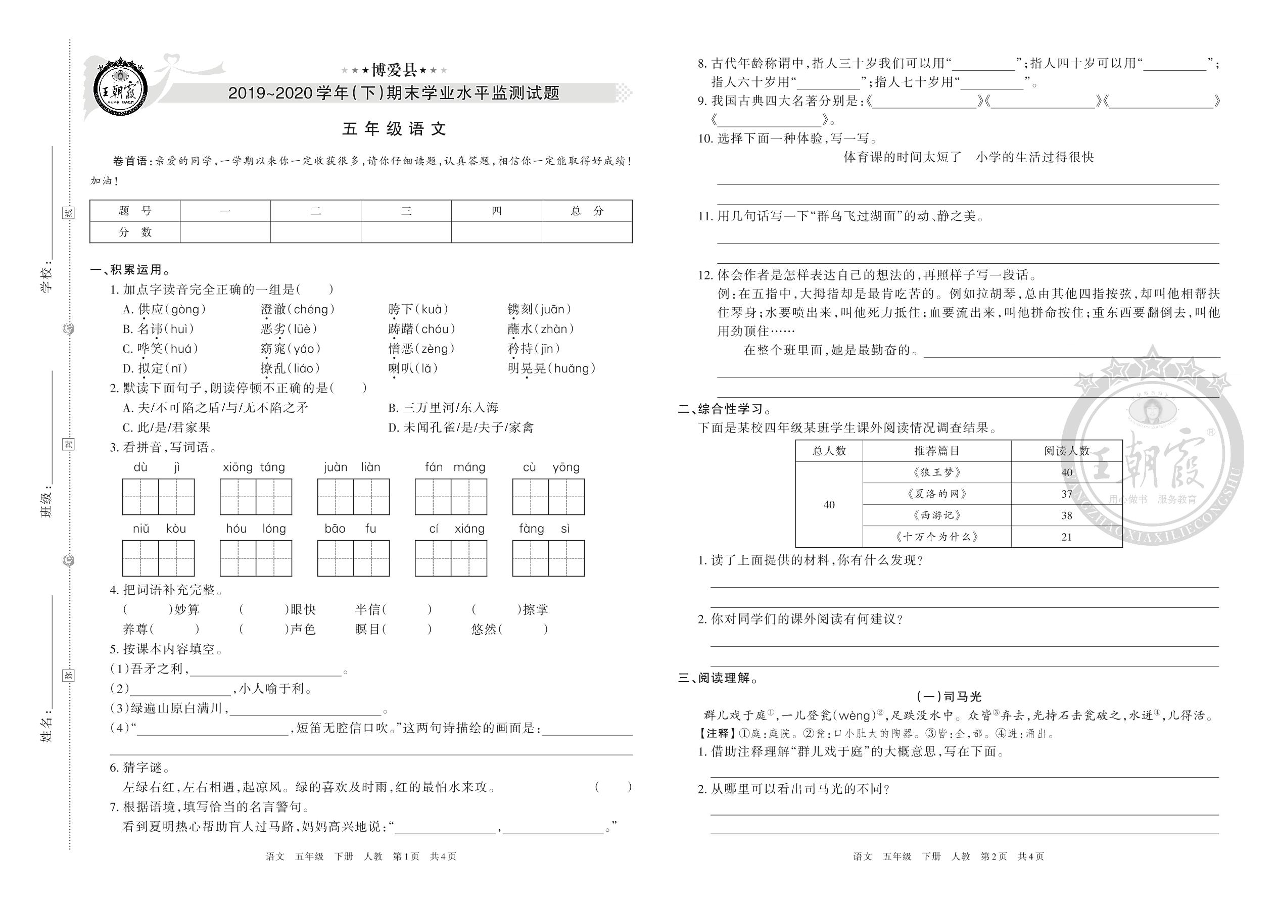 博爱县2019~2020学年(下)期末学业水平监测试题五年级语文(人教版)