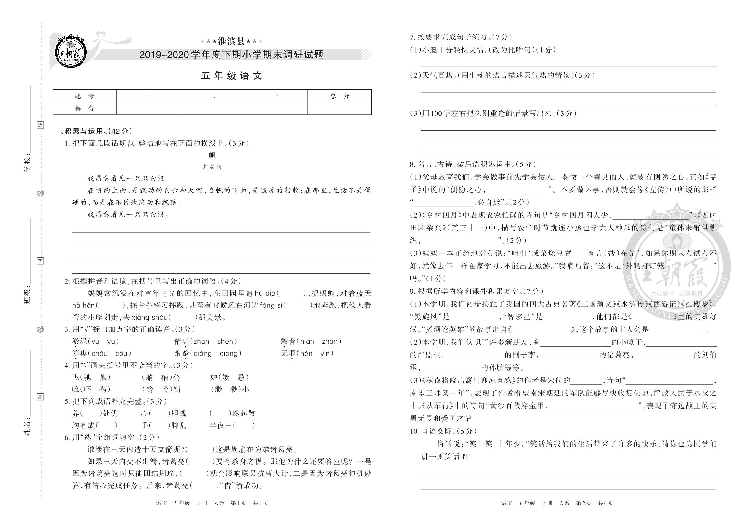 淮滨县2019-2020学年度下期小学期末调研试题五年级语文(人教版)