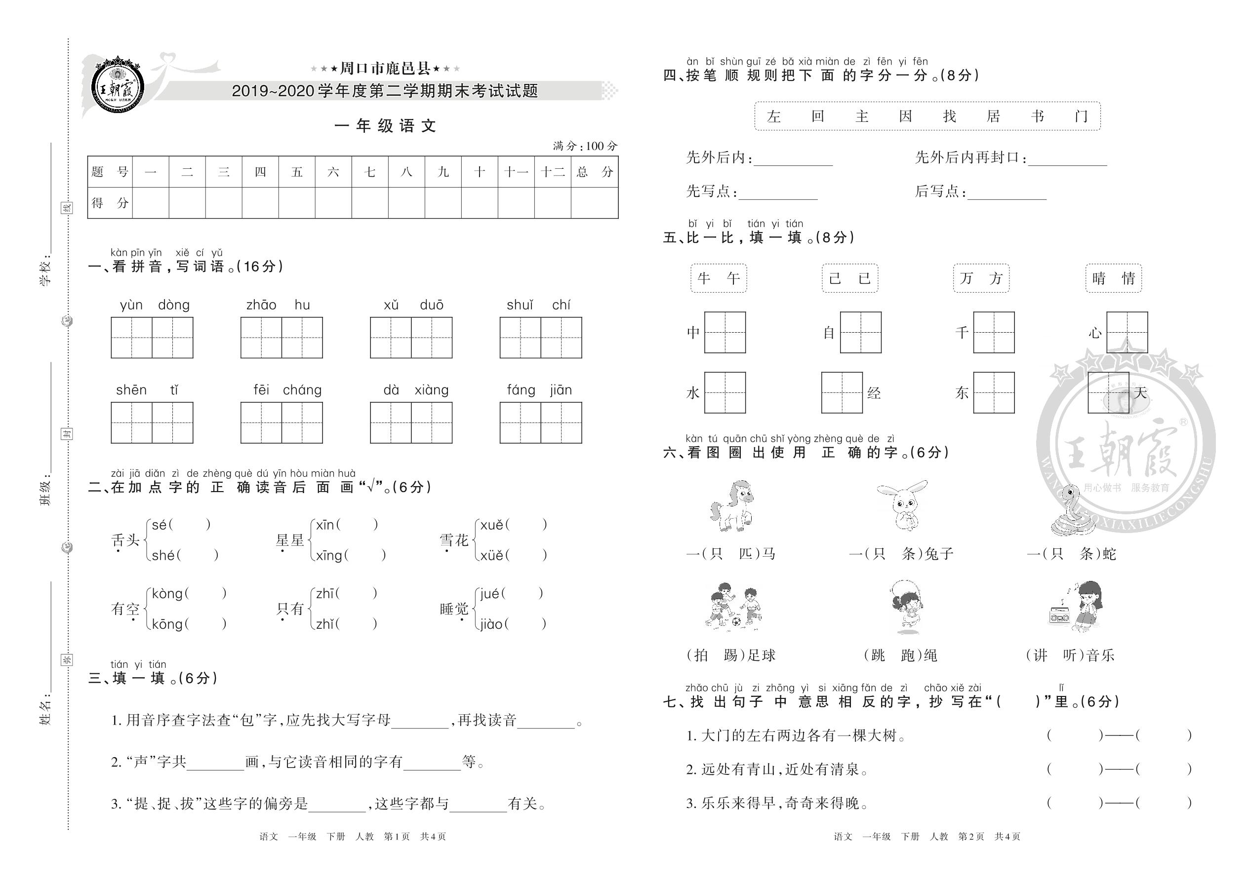 周口市鹿邑县2019-2020学年度第二学期期末考试试题一年级语文(人教版)