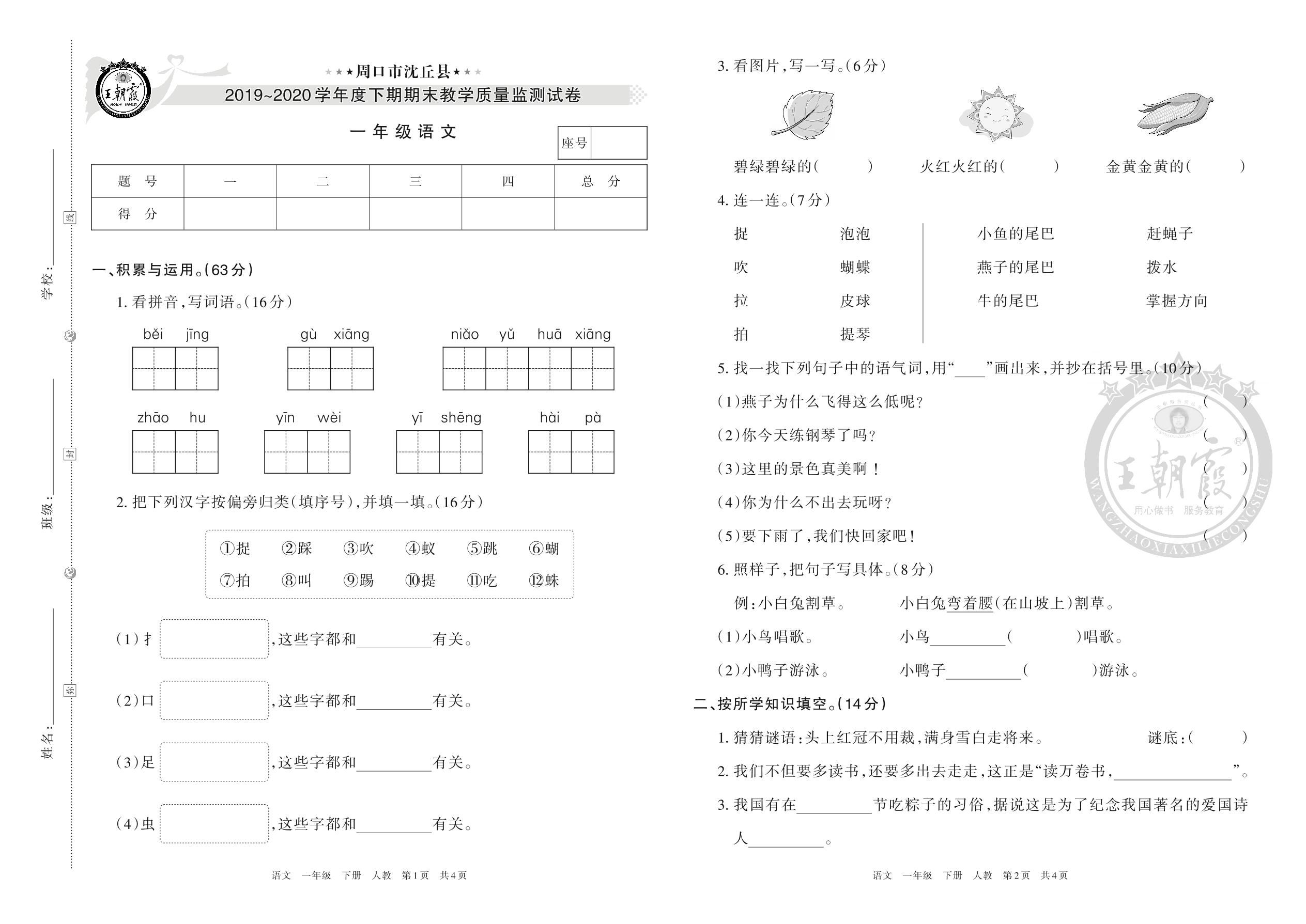 周口市沈丘县2019-2020学年度下期期末教学质量监测试卷一年级语文(人教版)