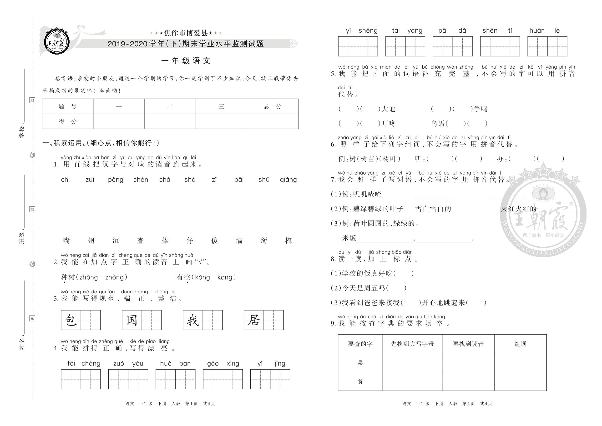 焦作市博爱县2019~2020学年(下)期末学业水平监测试题一年级语文(人教版)