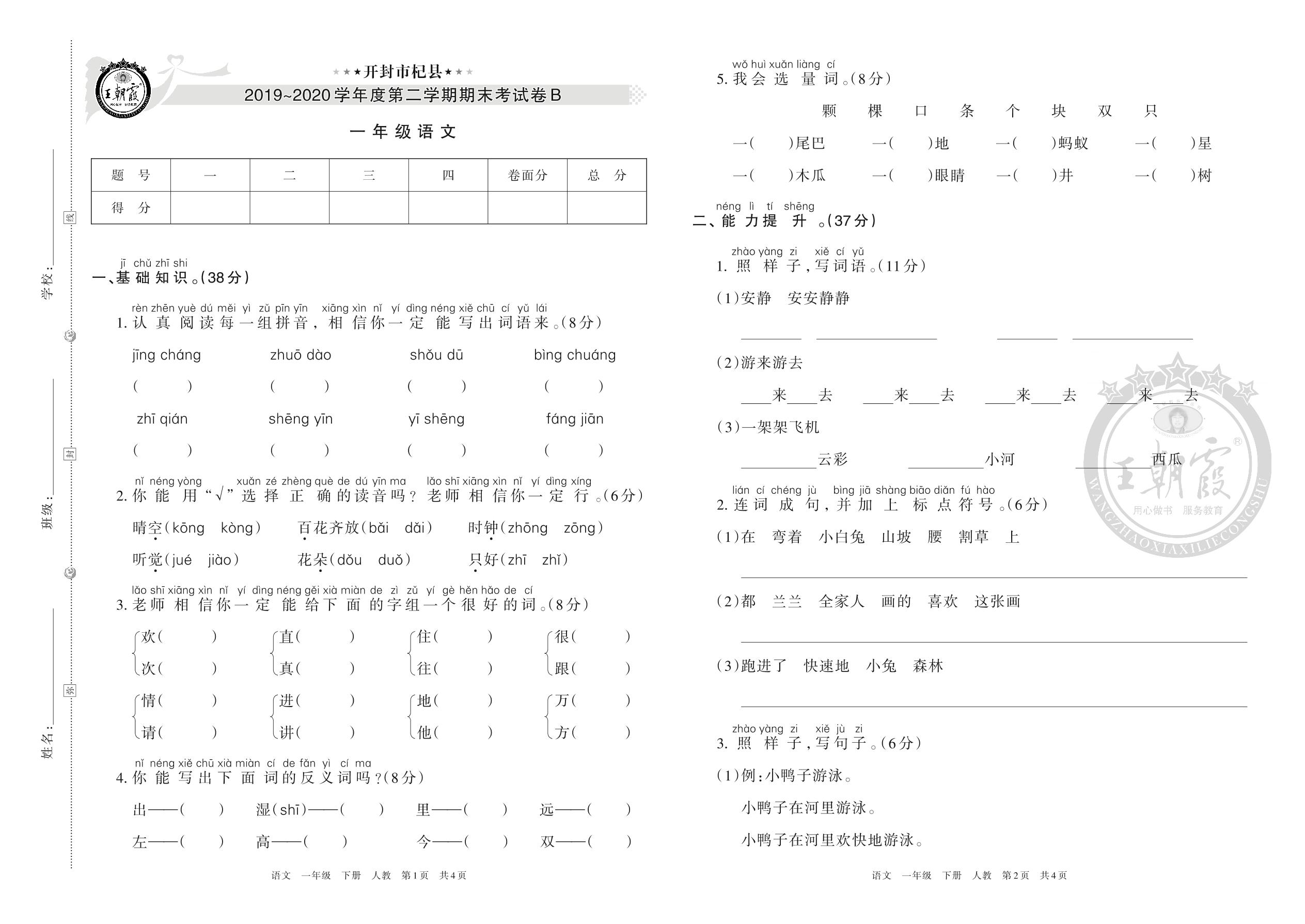 一年级语文人教版下册期末卷