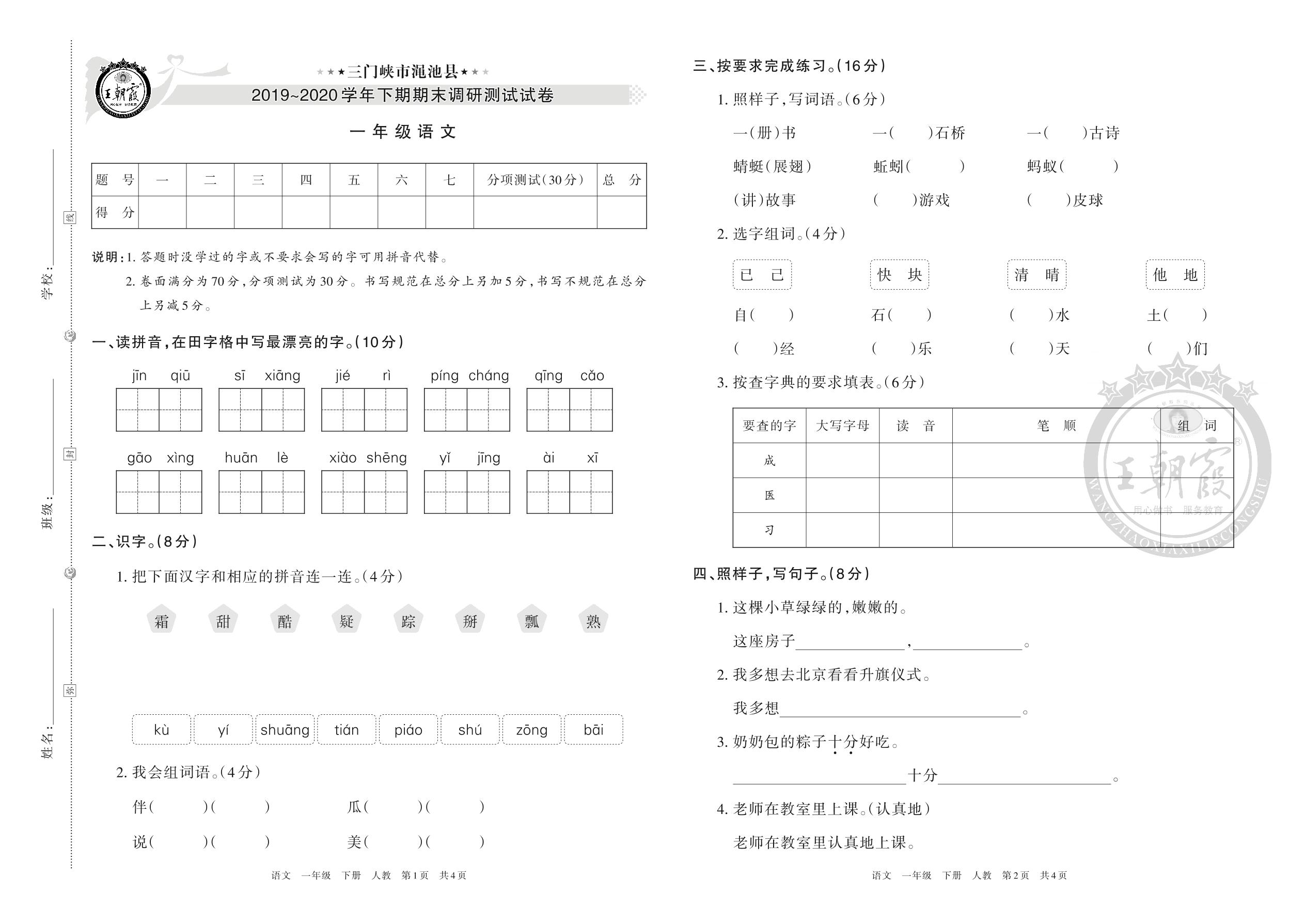 三门峡市渑池县2019-2020学年下期期末调研测试试卷一年级语文(人教版)